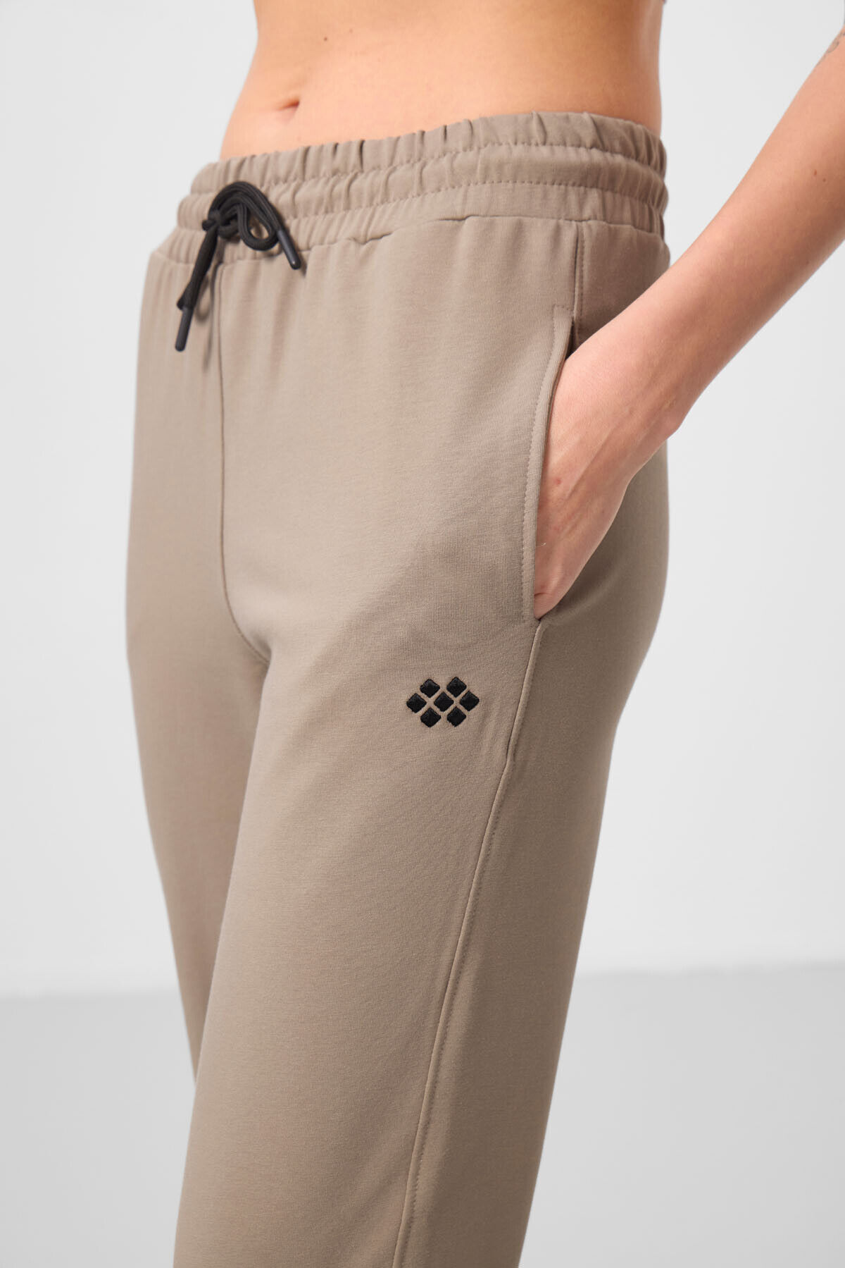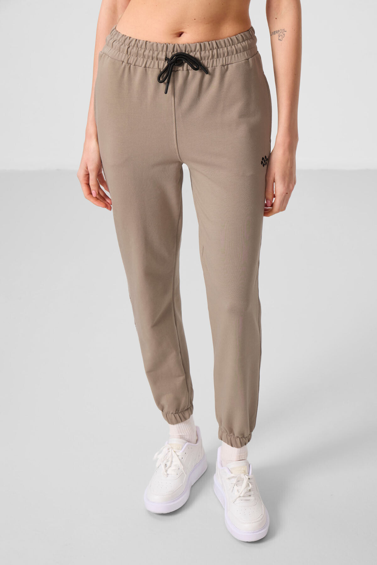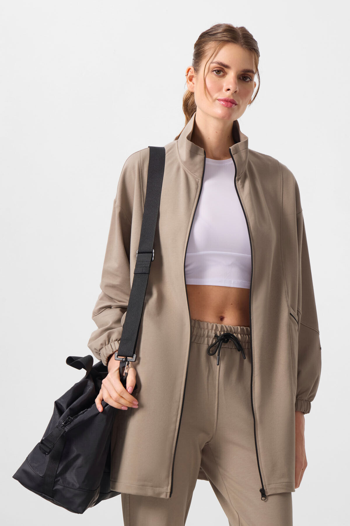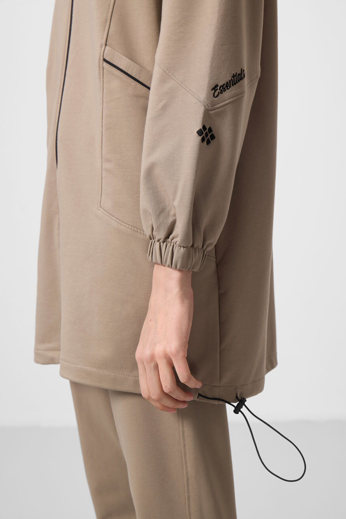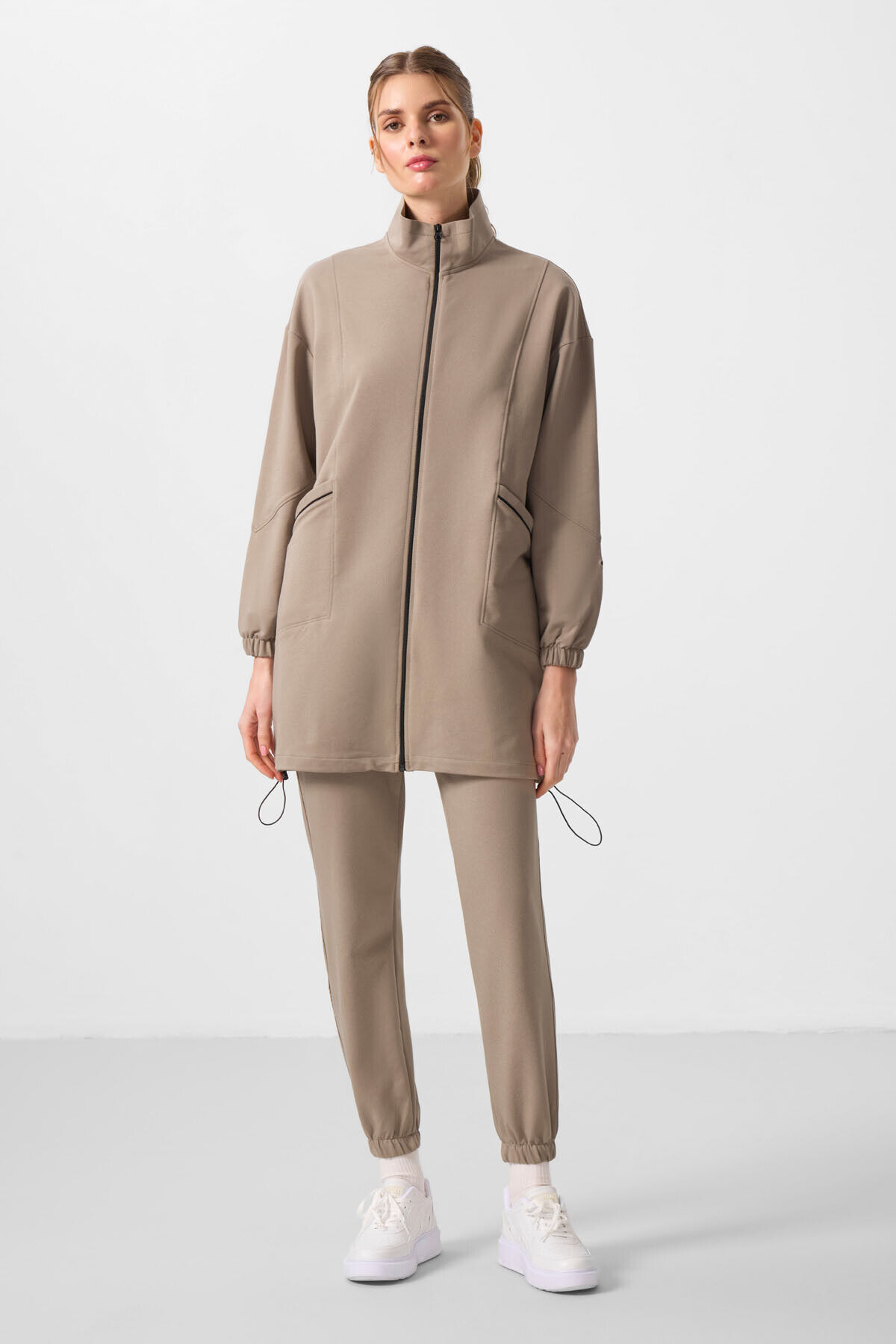 TommyLife Koyu Bej Dik Yaka Fermuarlı Rahat Form Kadın Eşofman Tunik Takım - 95345