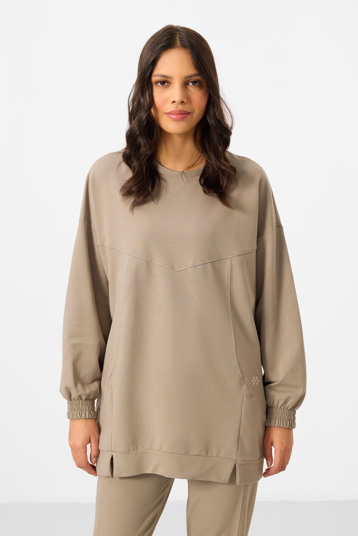 TommyLife Koyu Bej O Yaka Basic Oversize Kadın Eşofman Tunik Takım - 95347
