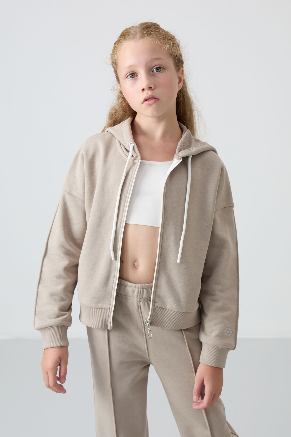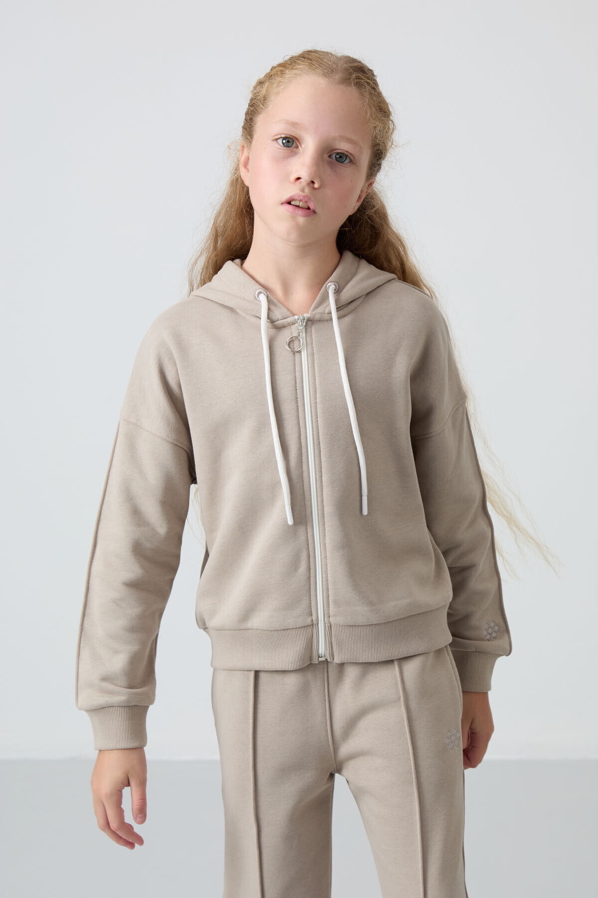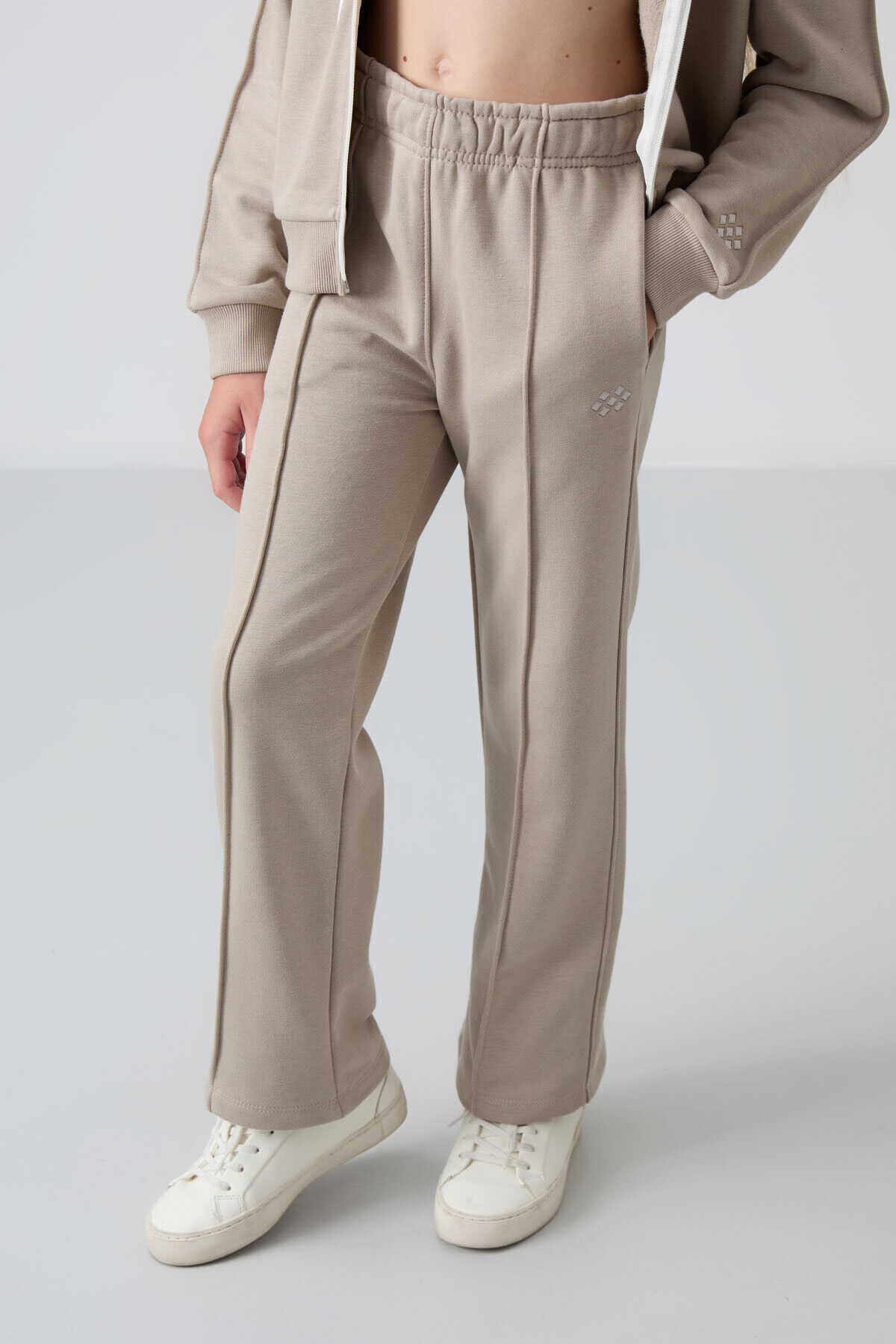 TommyLife Koyu Bej Pamuklu İçi Tüylü Yumuşak Dokulu Standart Fit Nakışlı Kız Çocuk Eşofman Takım - 75161