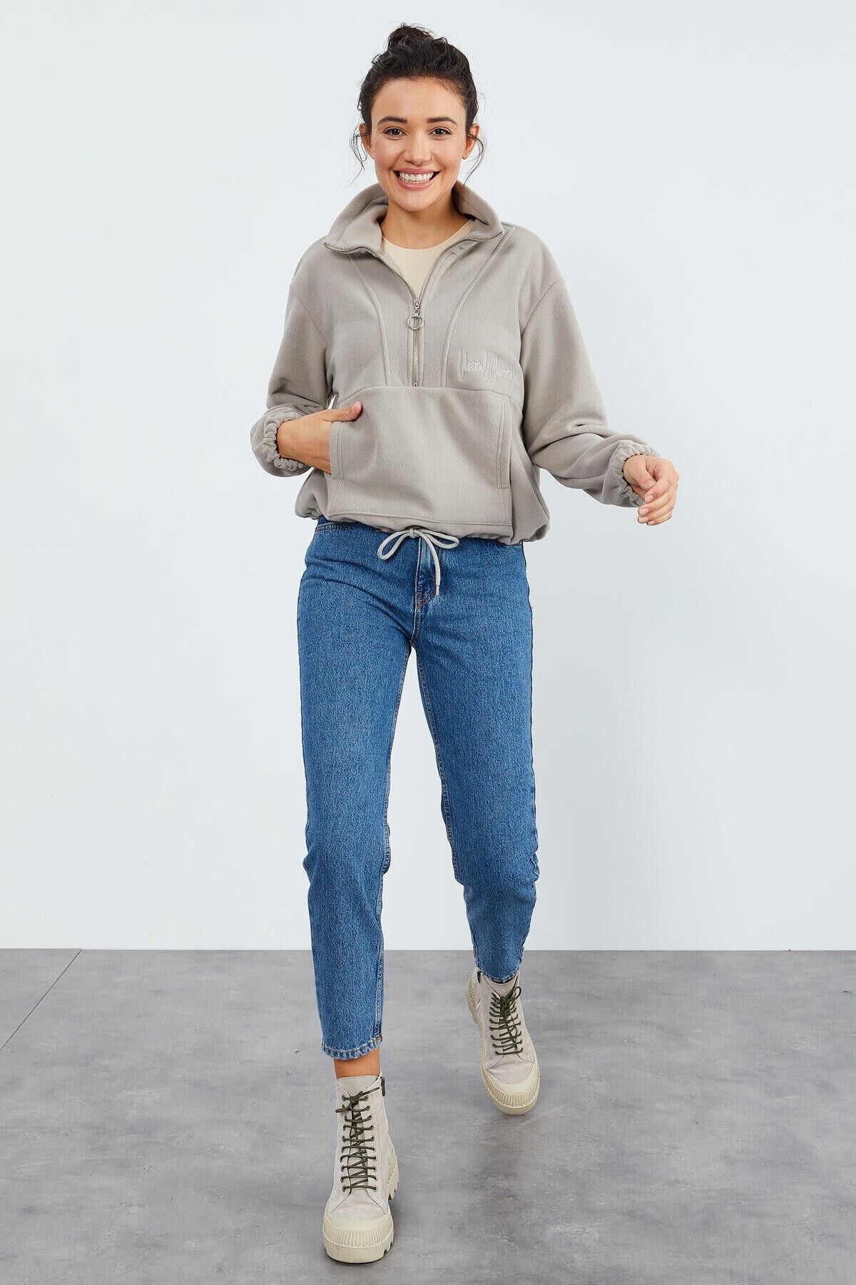 TommyLife Koyu Bej Yarım Fermuar Etek Ucu Büzgülü Kadın Polar Oversize Sweatshirt - 97171