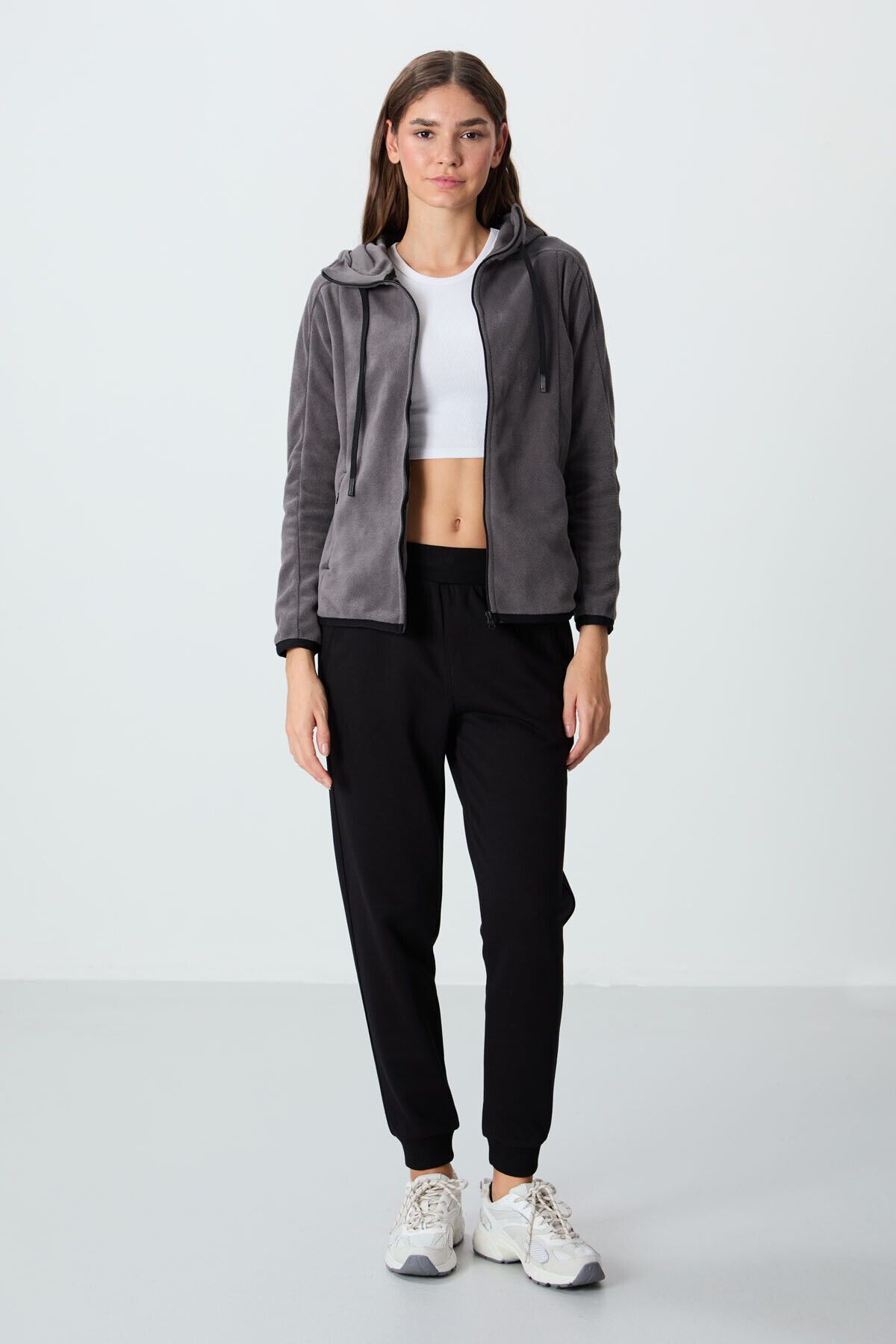 Koyu Gri Kalın Yumuşak Dokulu Kapüşonlu Standart Fit Nakışlı Polar Kadın Sweatshirt -97287