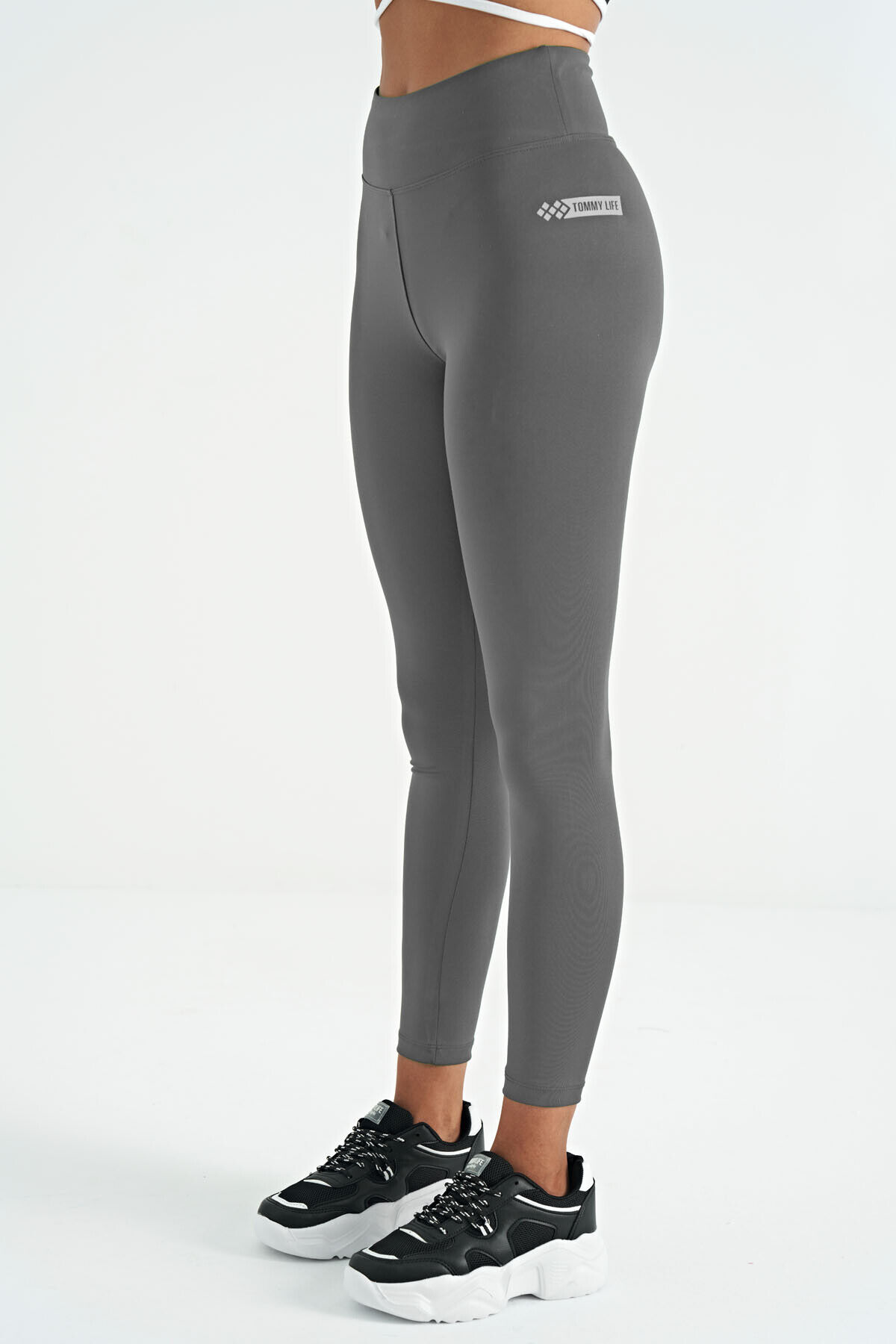 TommyLife Koyu Gri Logo Baskı Detaylı Yüksek Bel Dalgıç Kumaş Slim Fit Kadın Tayt, şıklığı ve konforu bir arada arayan kadınlar için ideal bir seçenektir. Spor yaparken ya da günlük hayatta rahatlıkla kullanılabilir. Sade ve şık tasarımıyla her tarza uyum sağlar.