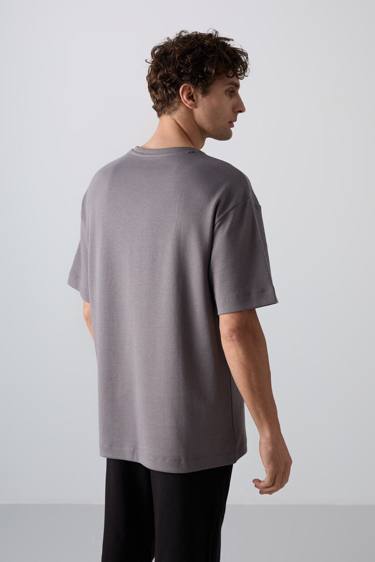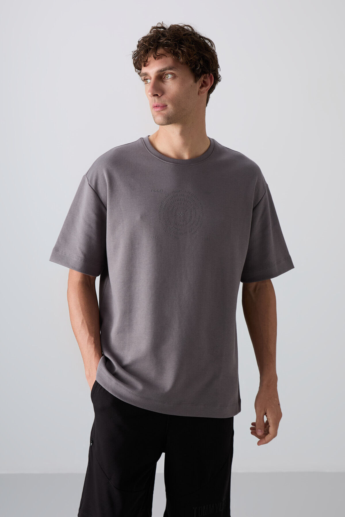 TommyLife Koyu Gri Pamuklu Kalın Yumuşak Dokulu Oversize Fit Baskılı Erkek T-Shirt - 88324