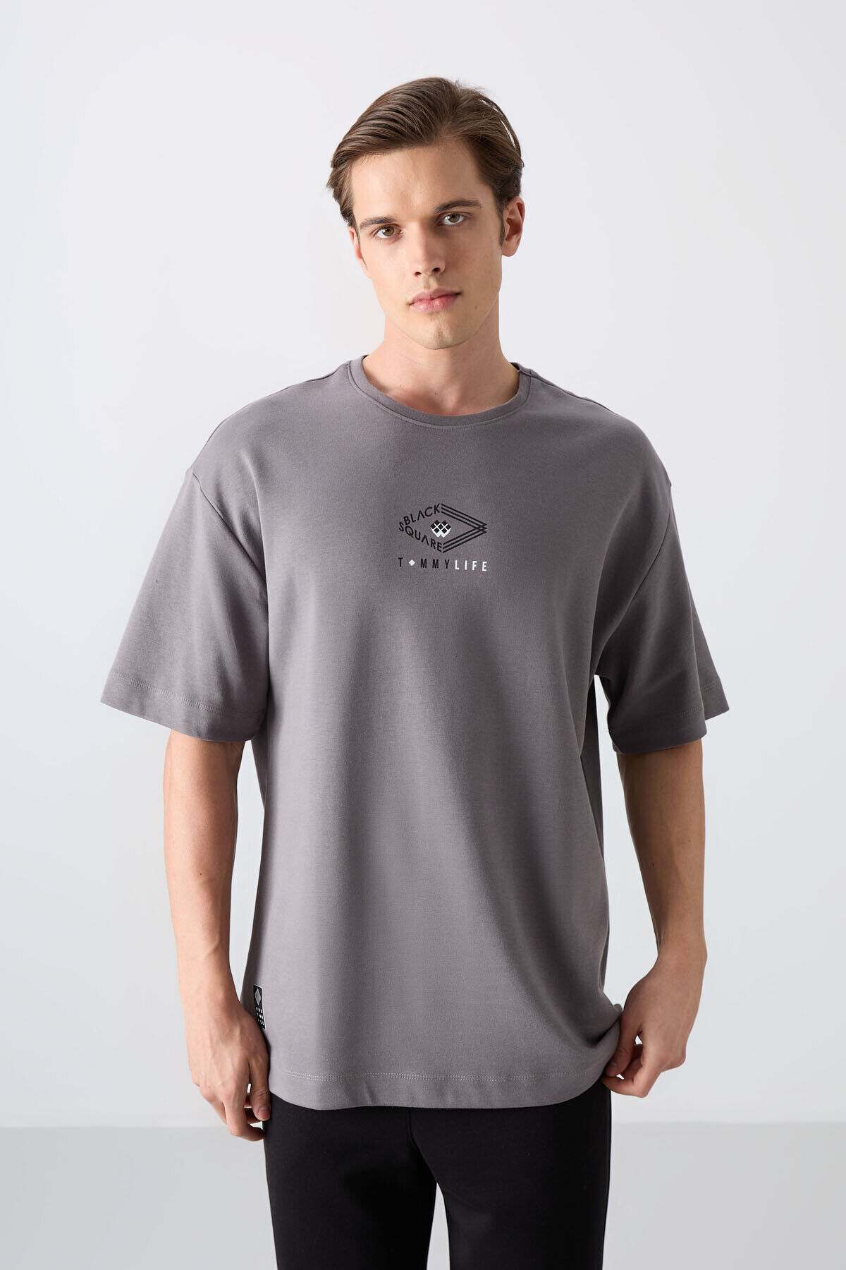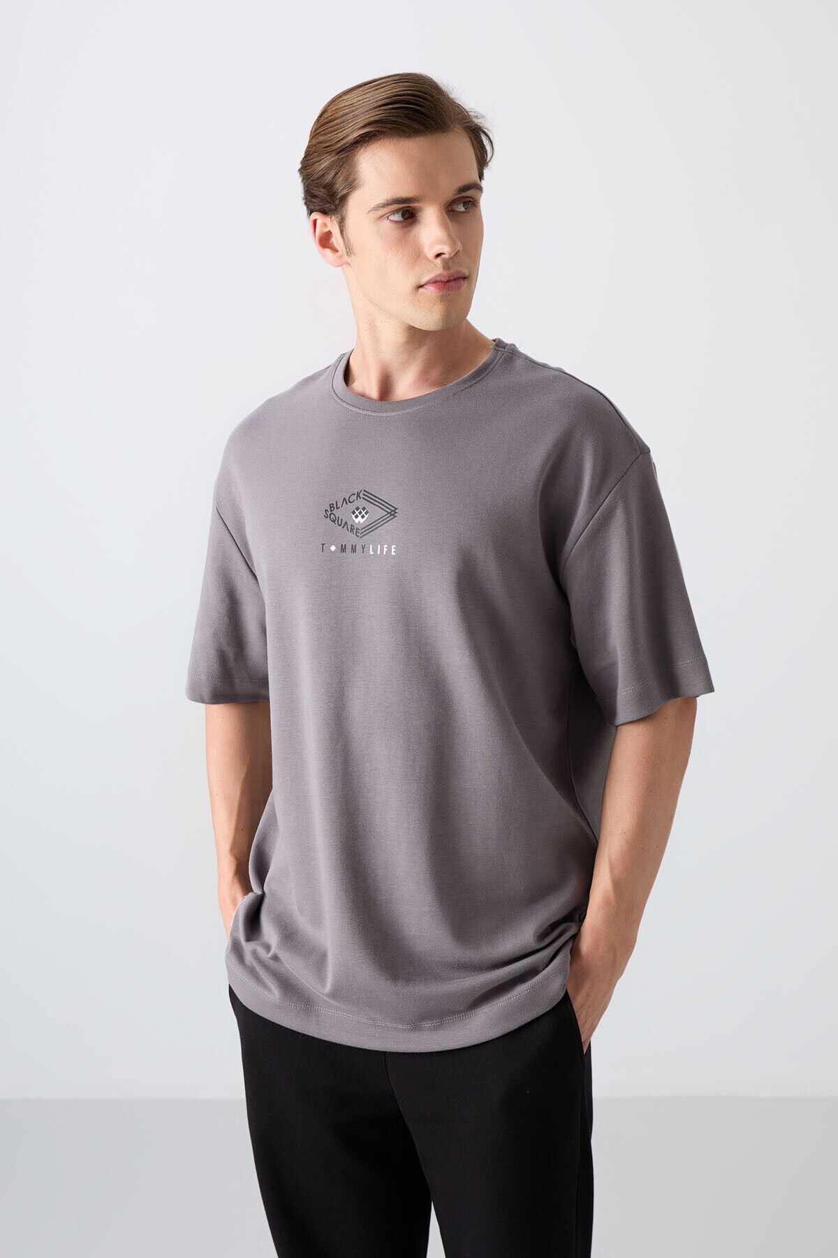 TommyLife Koyu Gri Pamuklu Kalın Yumuşak Dokulu Oversize Fit Baskılı Erkek T-Shirt - 88325