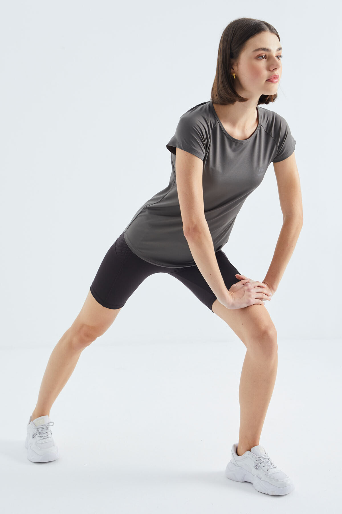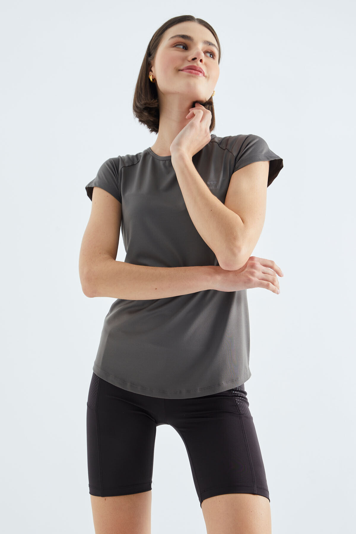 TommyLife Koyu Gri Sırt Pencereli Kısa Kol Standart Kalıp O Yaka Kadın T-Shirt - 97101