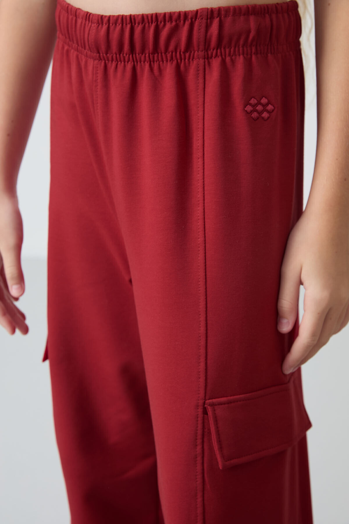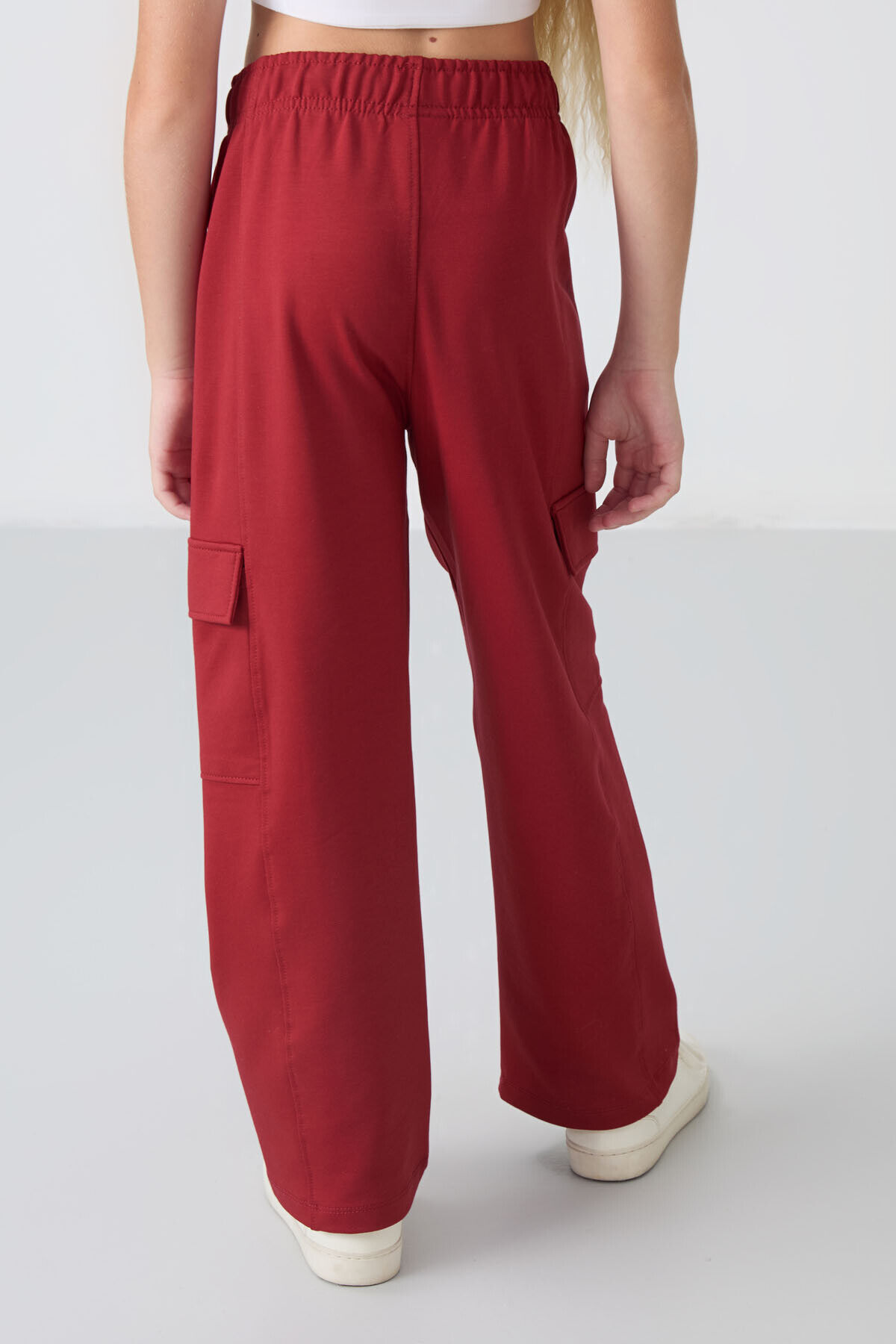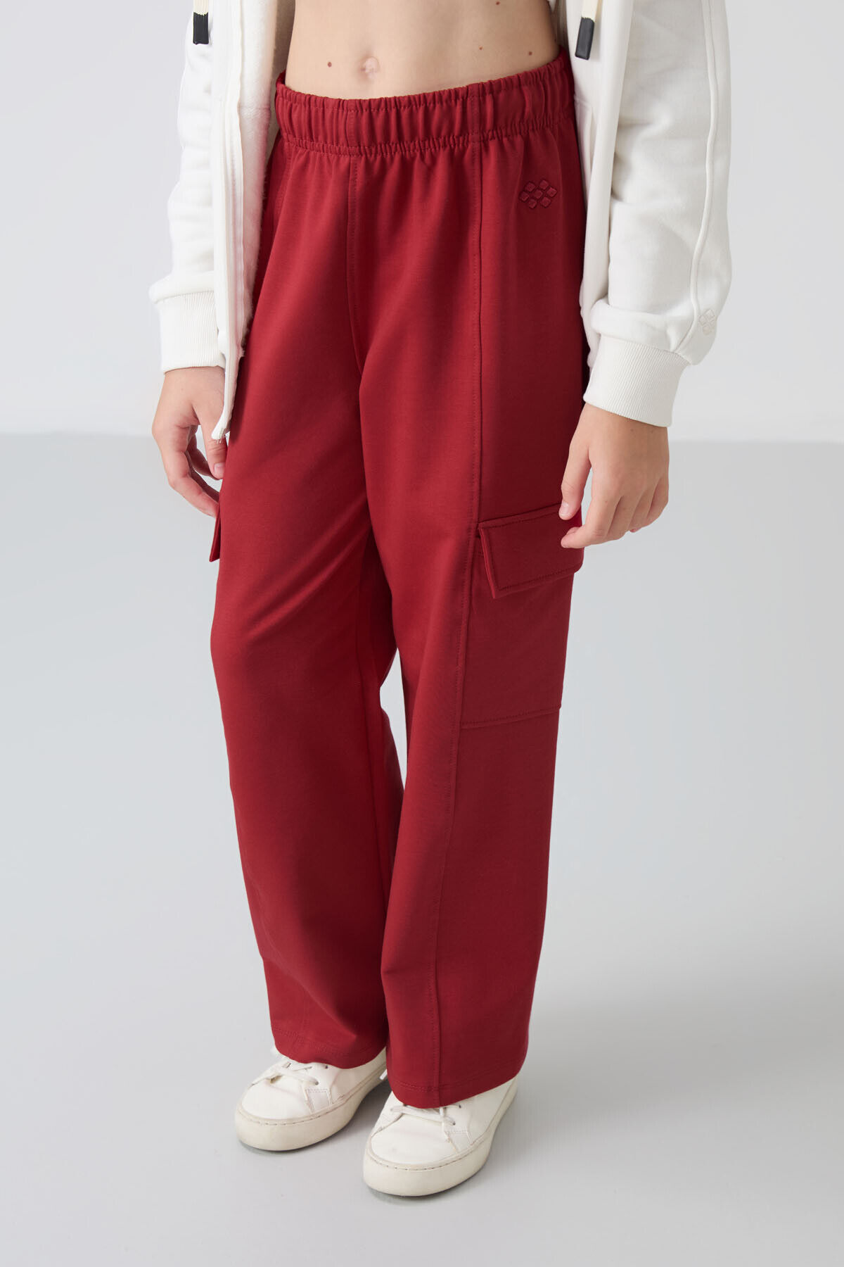 TommyLife Koyu Kırmızı Kargo Cepli Ön Dikiş Detaylı Geniş Paça Kız Çocuk Eşofman Altı - 75143