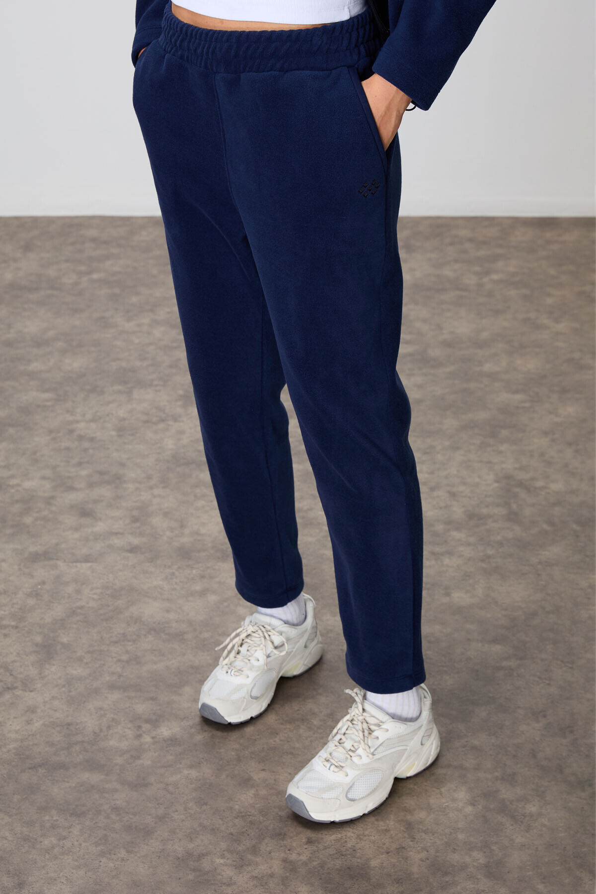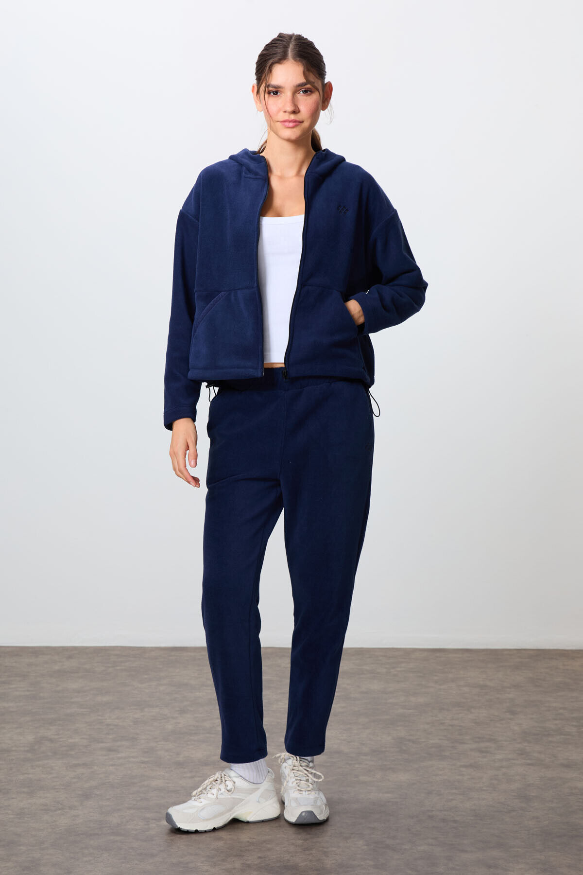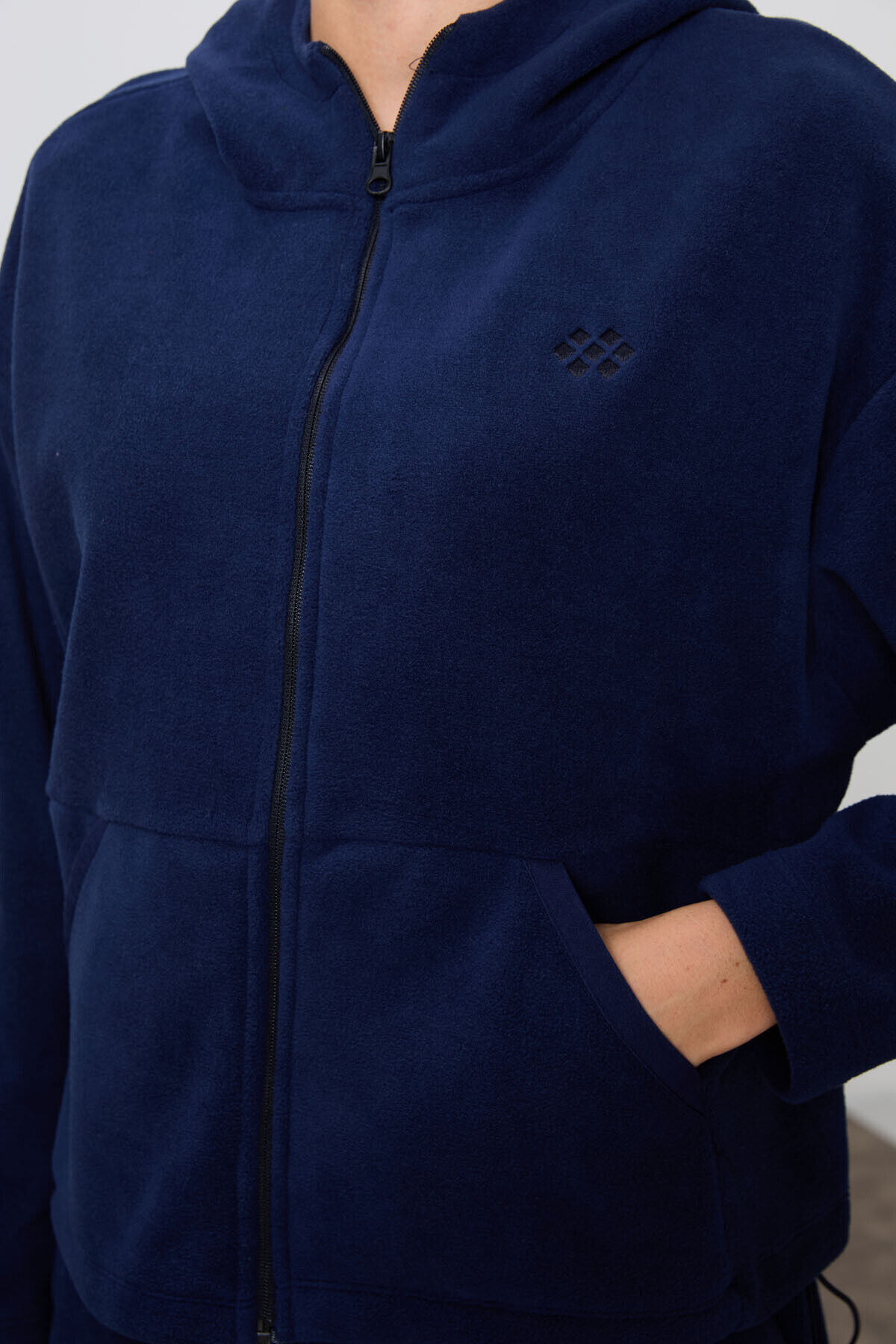 Lacivert Kalın Yumuşak Dokulu Kapüşonlu Oversize Nakışlı Polar Kadın Eşofman Takım -95338
