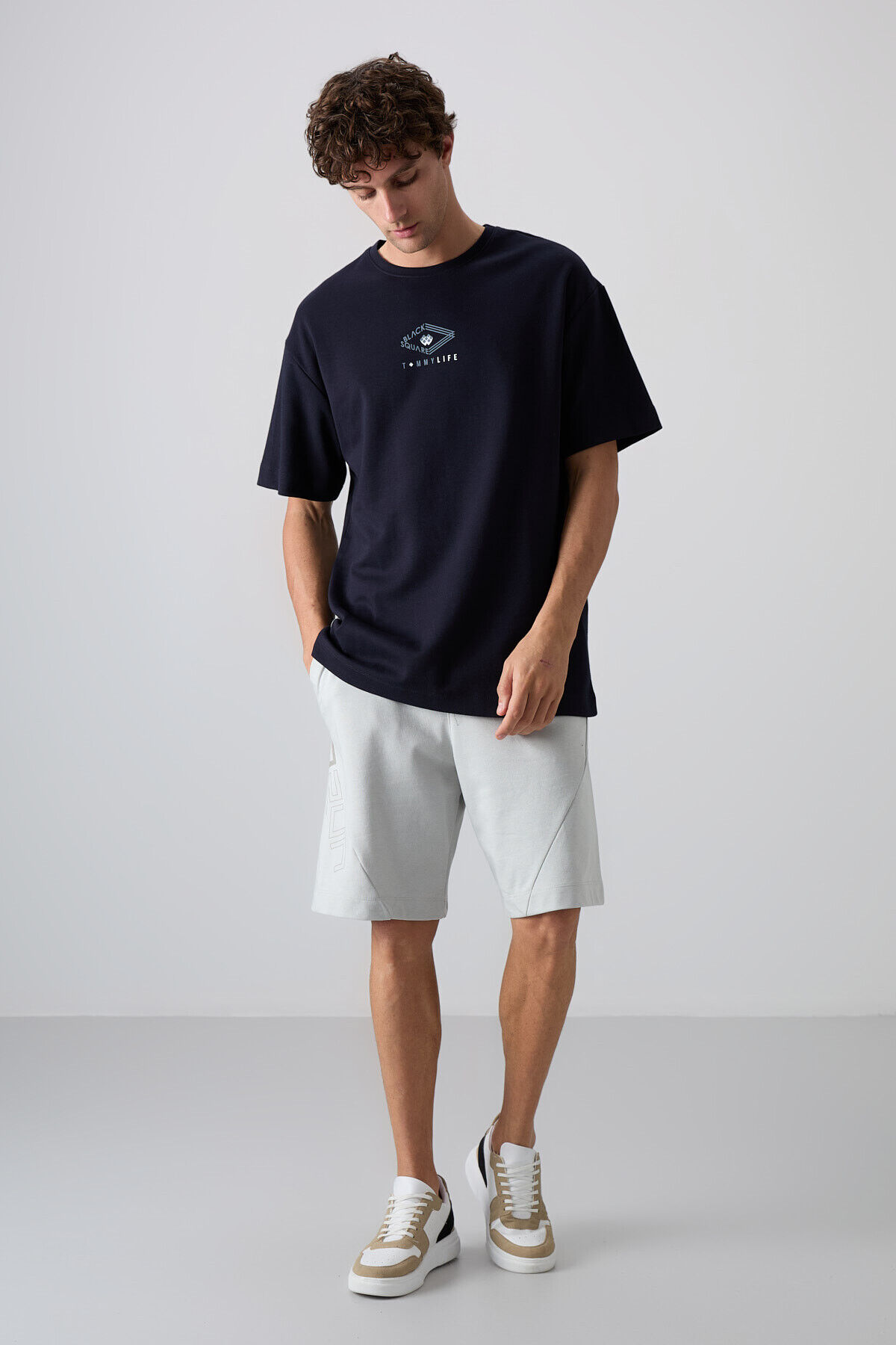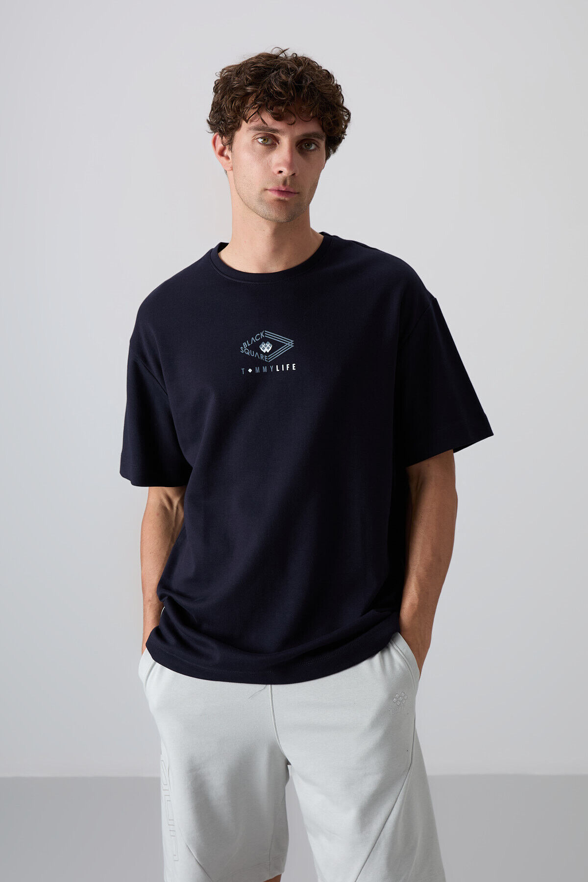 TommyLife Lacivert Pamuklu Kalın Yumuşak Dokulu Oversize Fit Baskılı Erkek T-Shirt - 88325