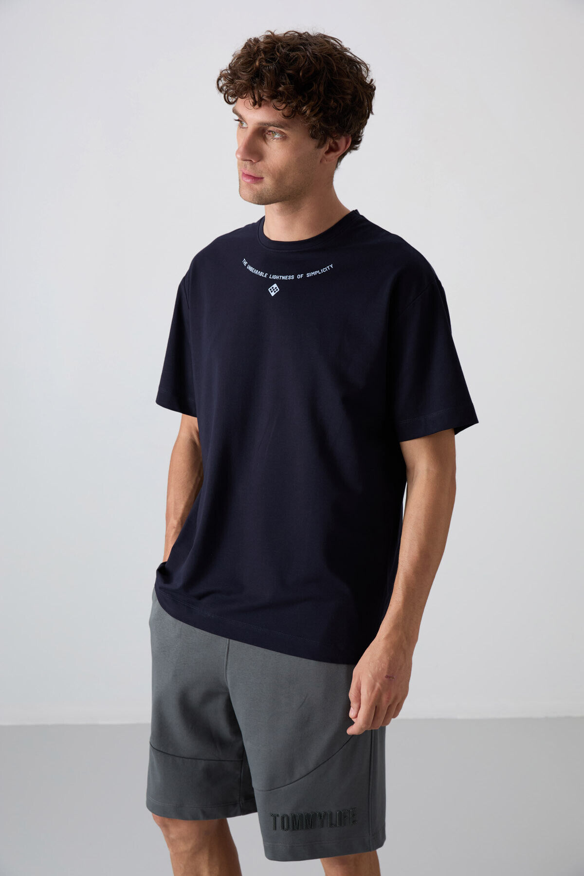 TommyLife Lacivert Pamuklu Kalın Yumuşak Dokulu Oversize Fit Baskılı Erkek T-Shirt - 88343