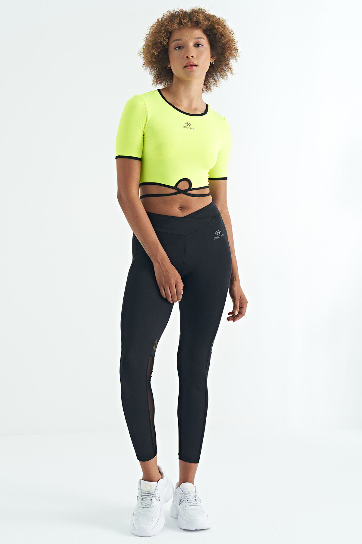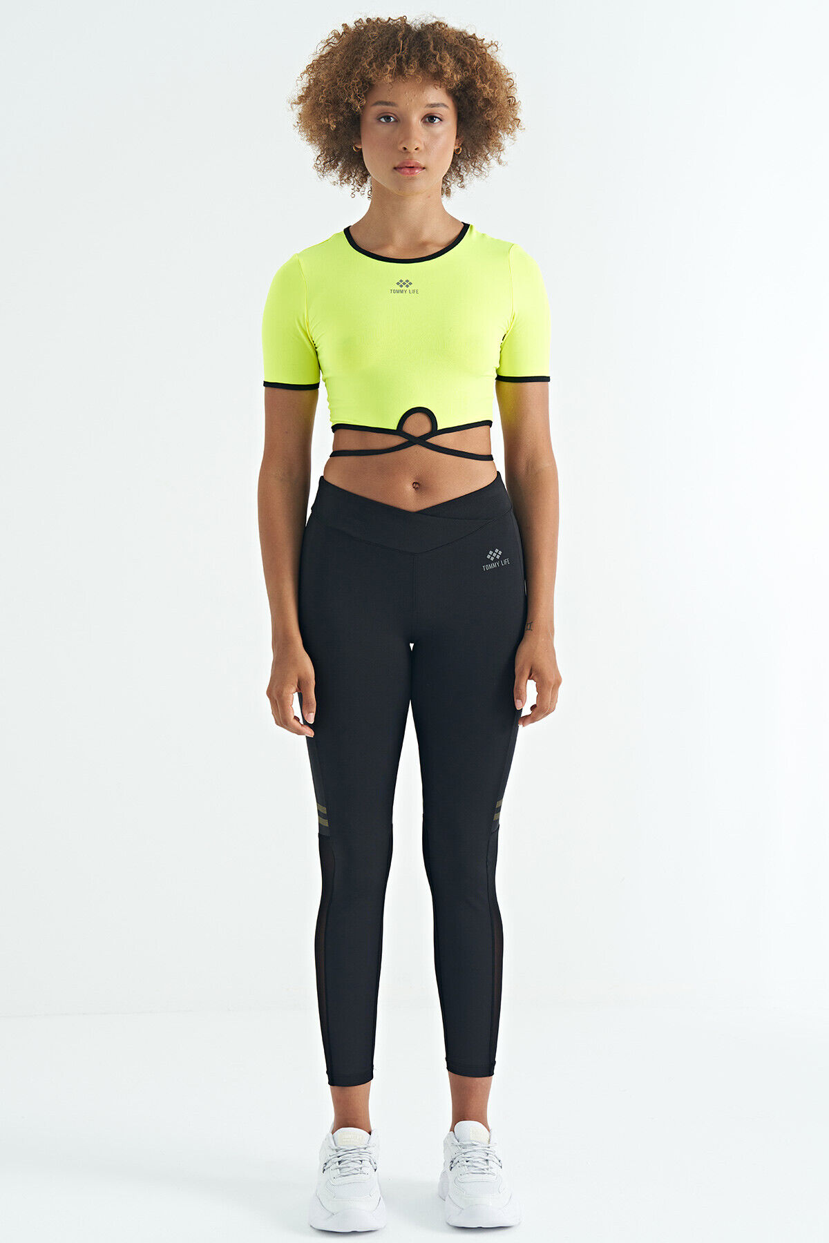 TommyLife Neon Sarı Bel Bağlama Detaylı O Yaka Standart Kalıp Dalgıç Kumaş Kadın Crop T-Shirt - 97266