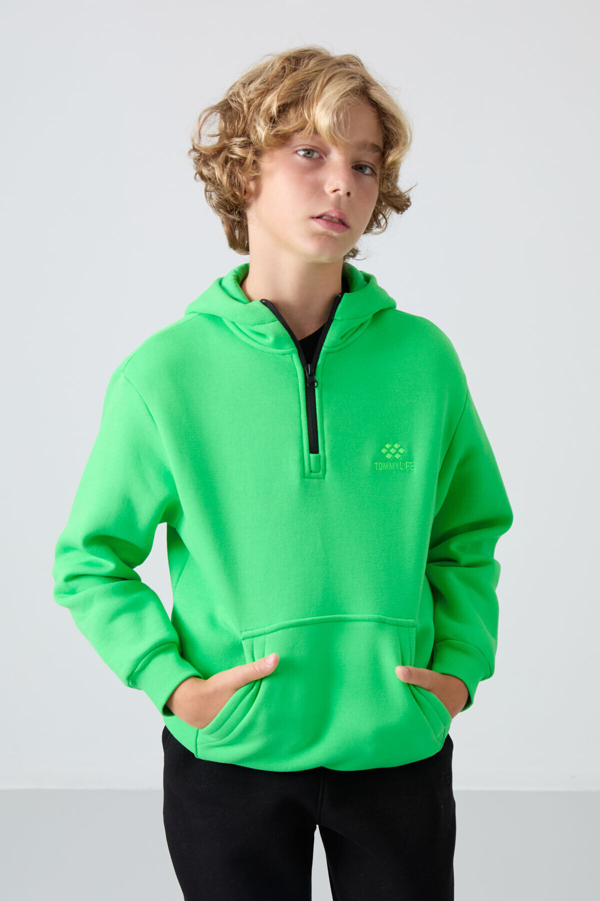 TommyLife Neon Yeşil Pamuklu Kalın İçi Tüylü Standart Fit Nakışlı Erkek Çocuk Sweatshirt - 11244