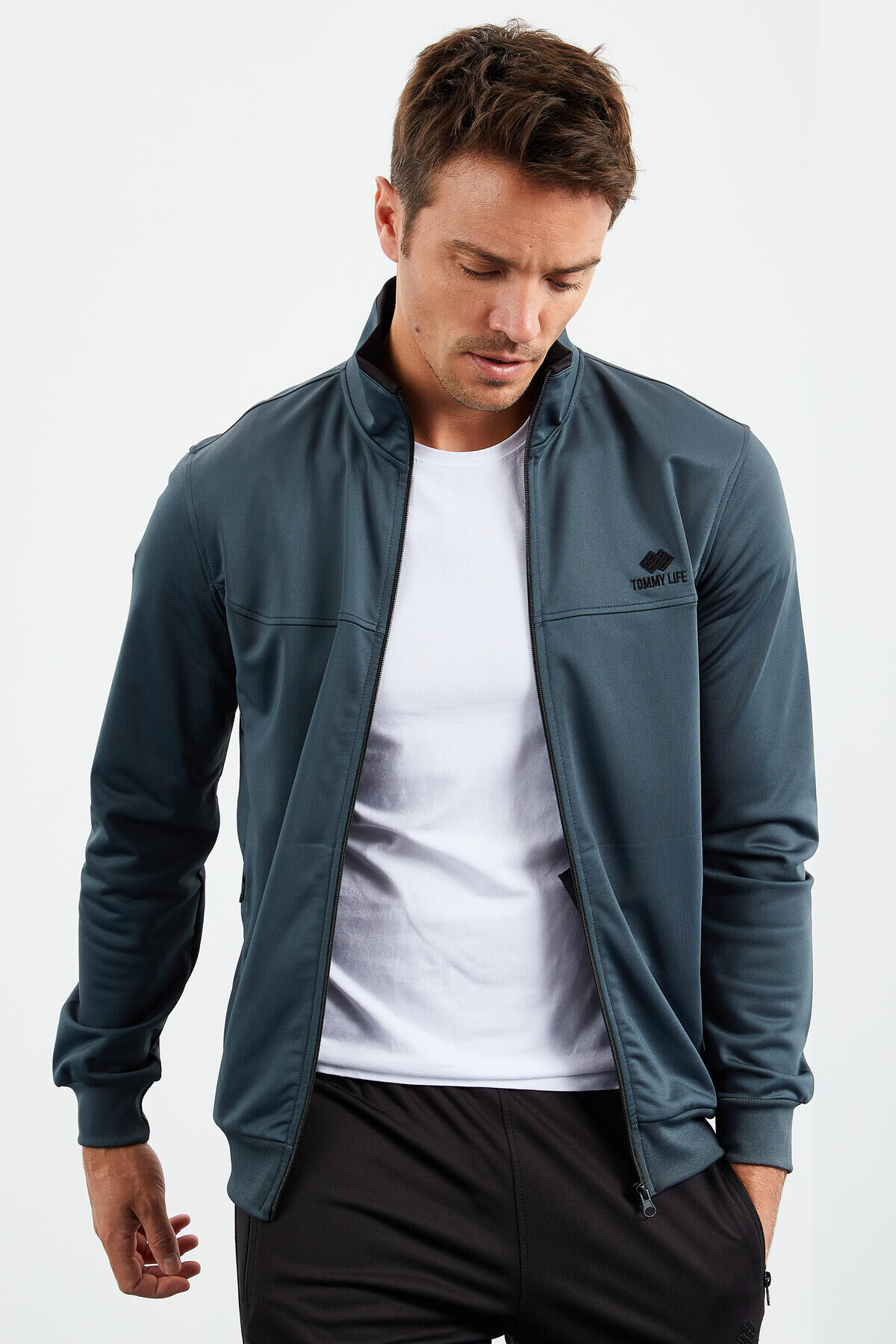 TommyLife Orman Yeşil - Siyah Dik Yaka Fermuarlı Standart Kalıp Klasik Paça Erkek Eşofman Takımı - 85162