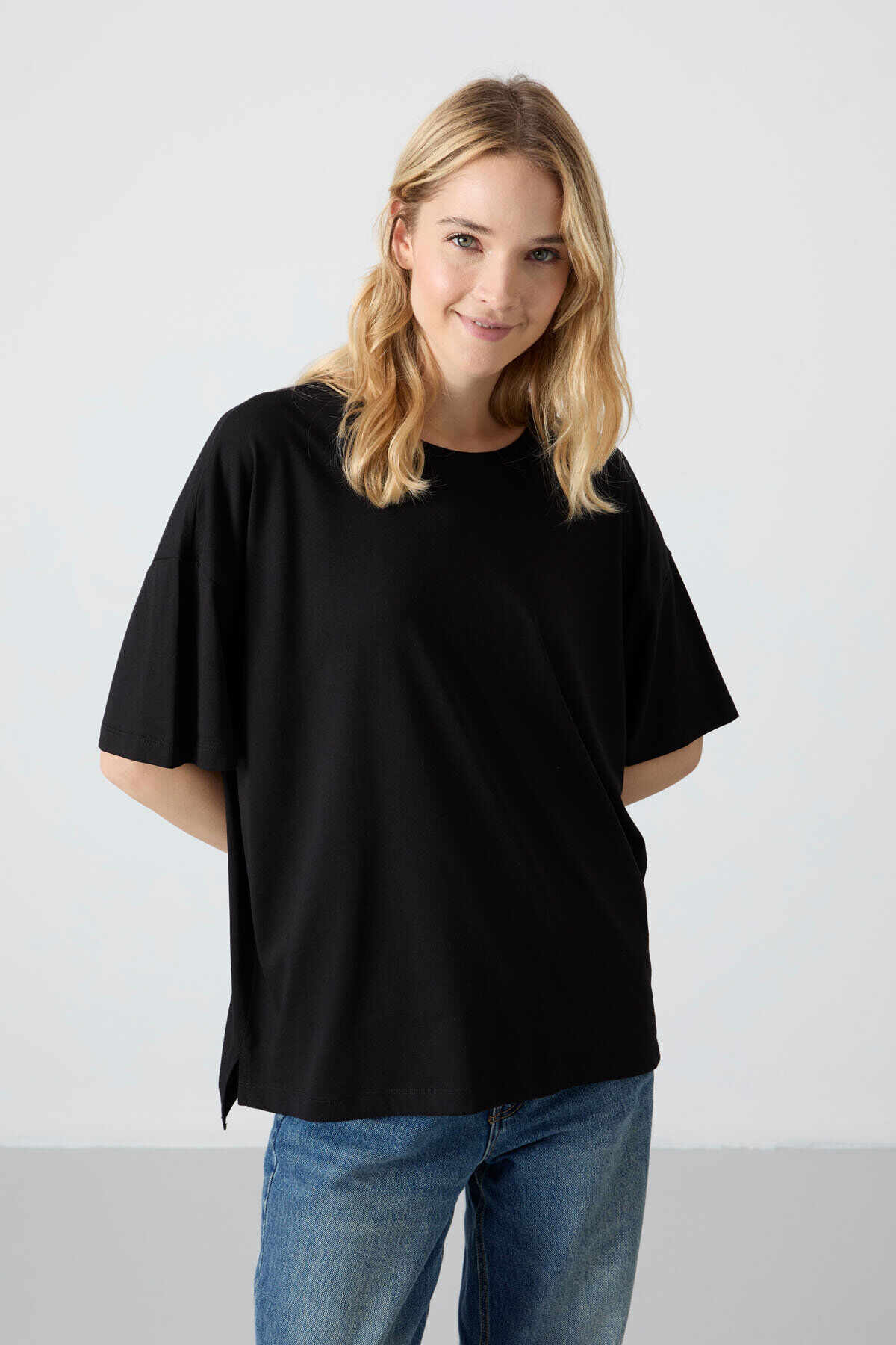 TommyLife Oversize Fit Basic O Yaka 3lü Paket Siyah-Beyaz-Açık Mavi Kadın T-Shirt 97285