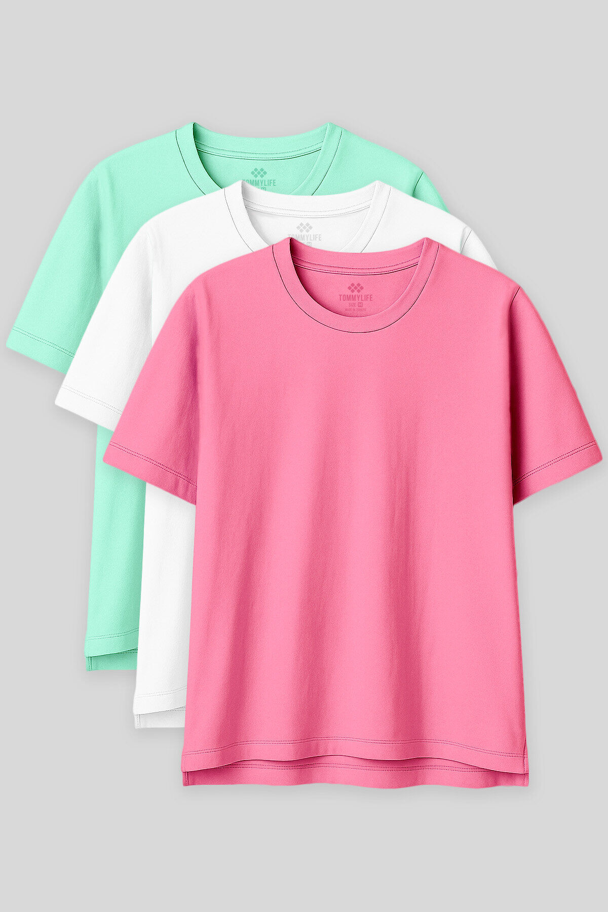 TommyLife Oversize Fit Basic O Yaka 3lü Paket Su Yeşili-Beyaz-Şeker Pembe Kadın T-Shirt 97285
