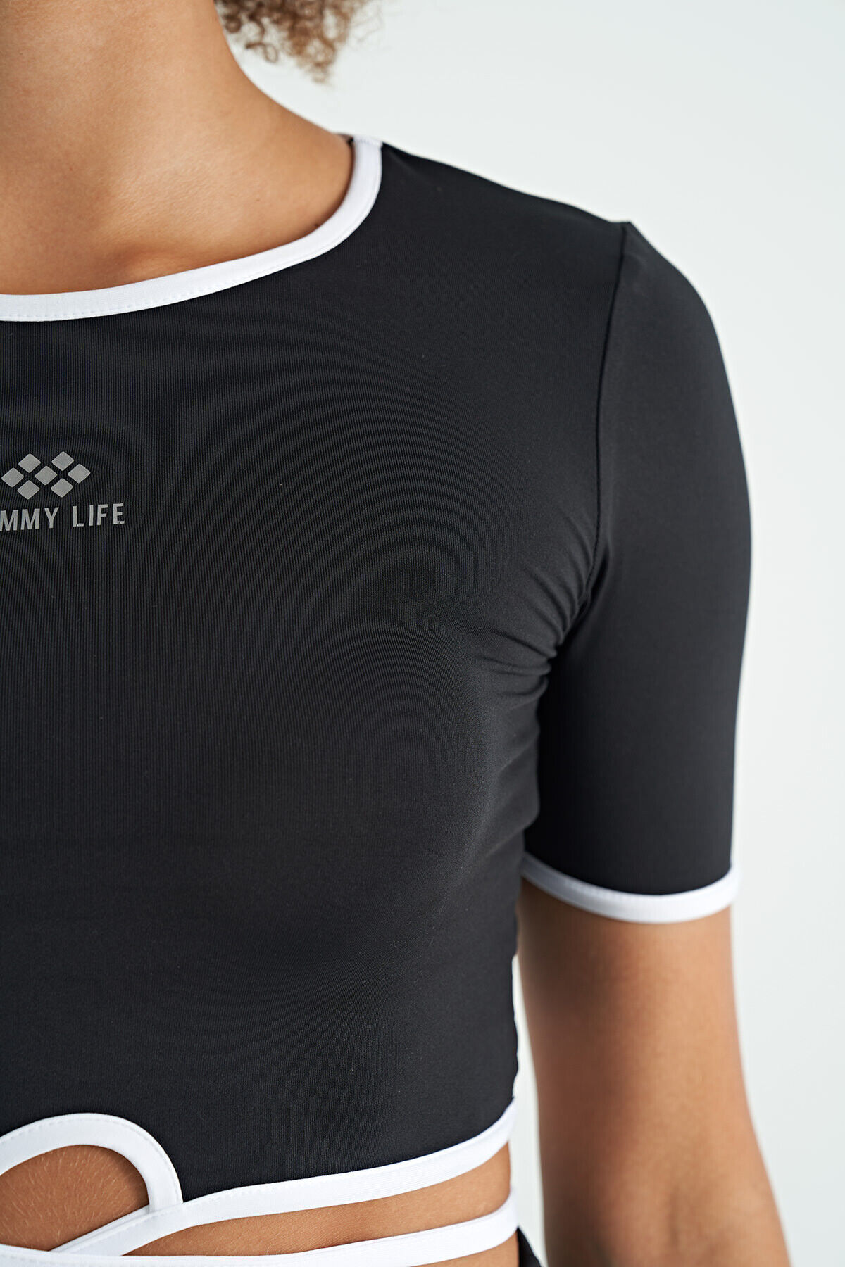 TommyLife Siyah Bel Bağlama Detaylı O Yaka Standart Kalıp Dalgıç Kumaş Kadın Crop T-Shirt - 97266