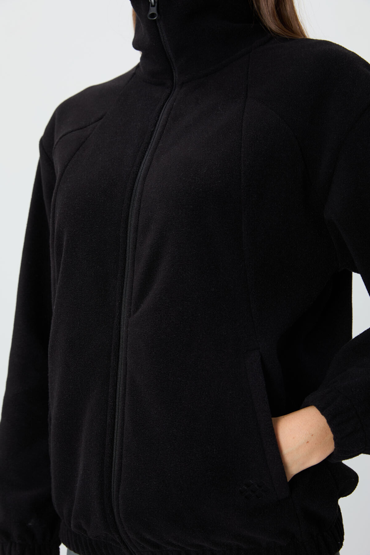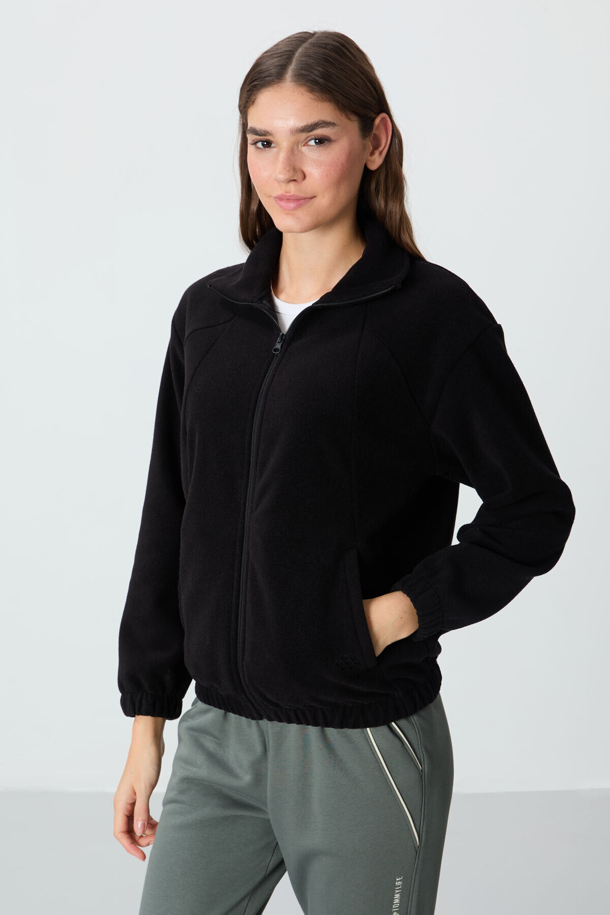 TommyLife Siyah Kalın Yumuşak Dokulu Dik Yaka Oversize Nakışlı Polar Kadın Sweatshirt - 97293