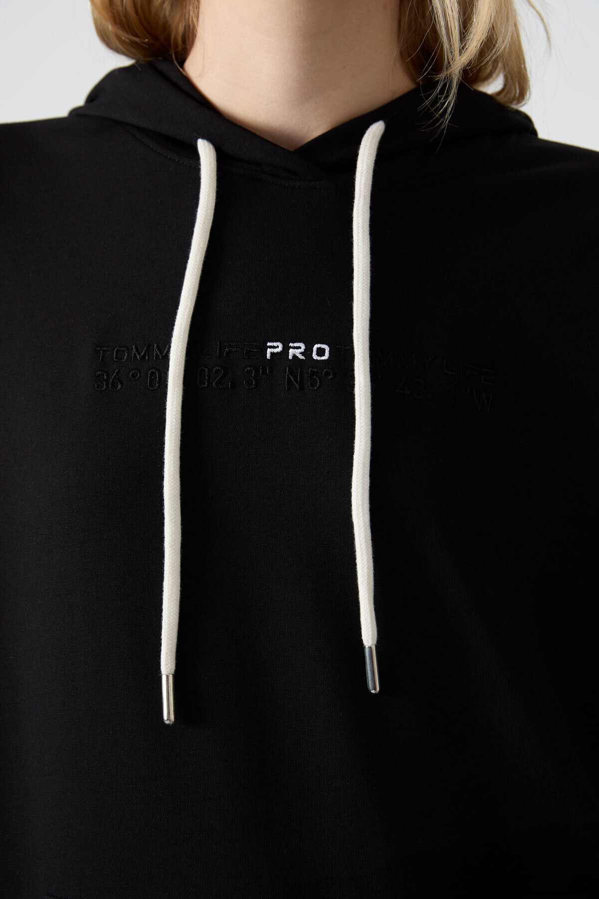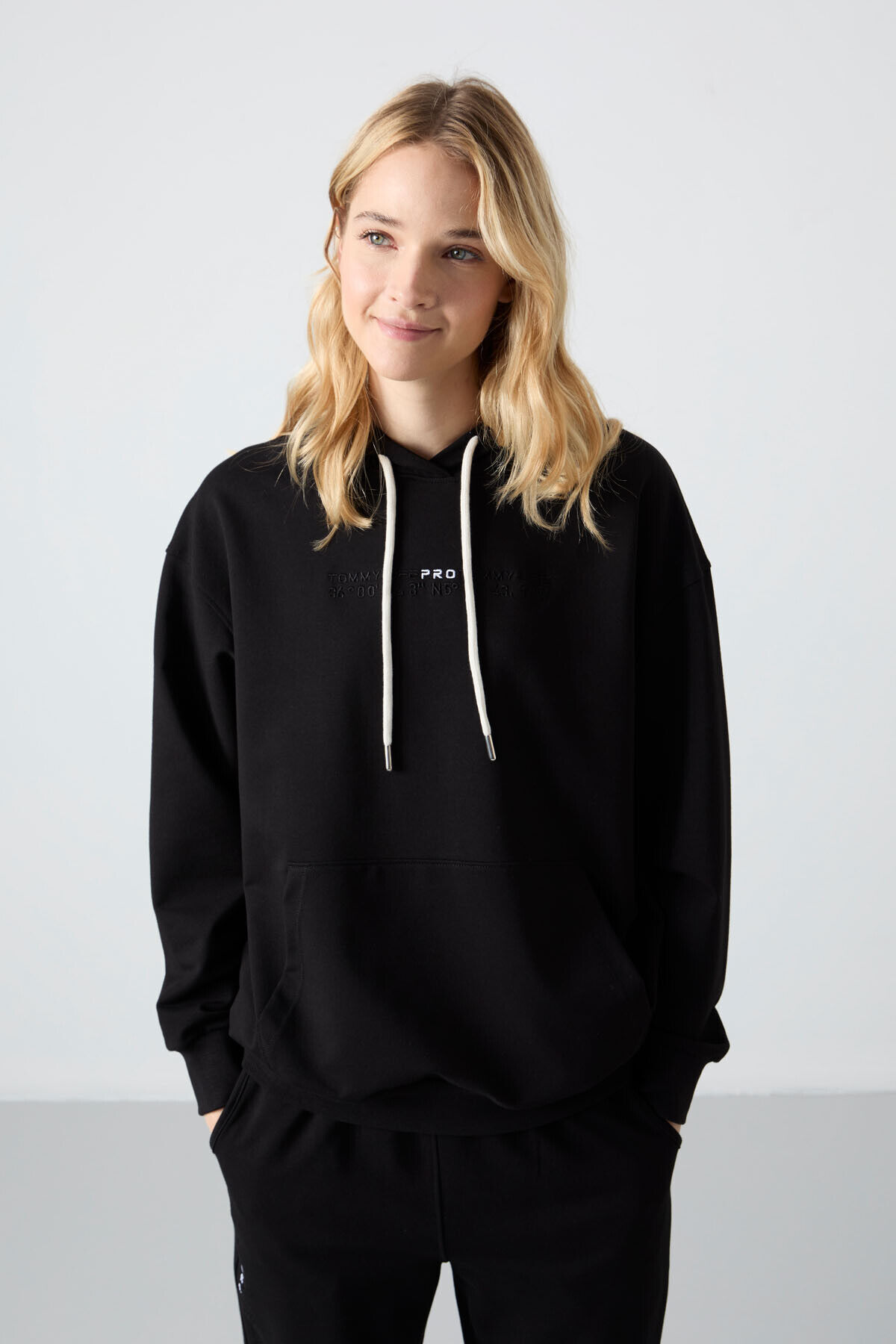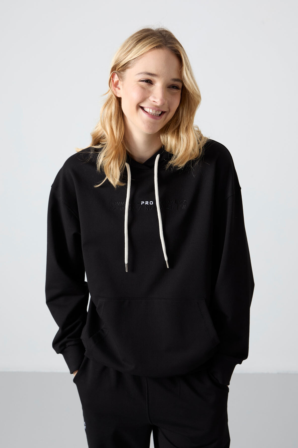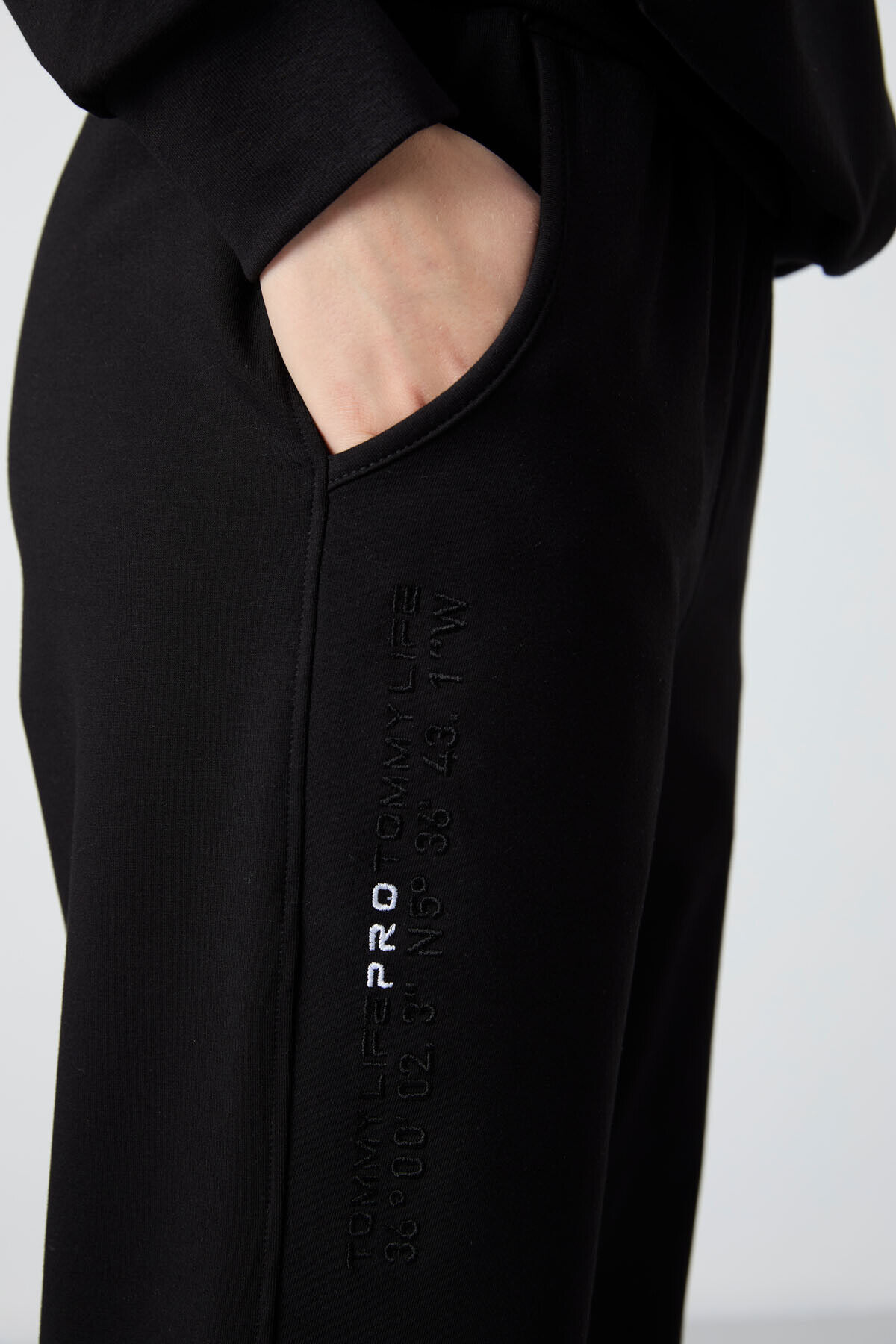TommyLife Siyah Kapüşonlu Kanguru Cep Oversize Lastik Paça Kadın Eşofman Takımı - 95288