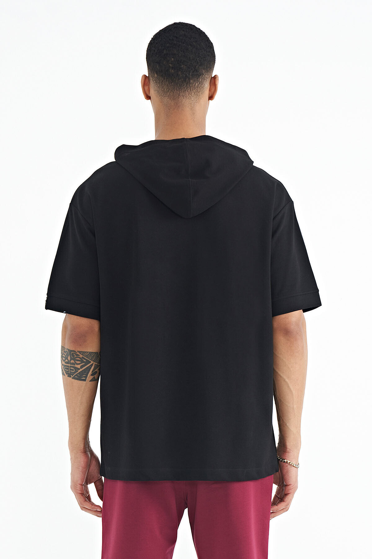 TommyLife Siyah Kapüşonlu Kol Etiket Detaylı Oversize Erkek T-shirt - 88179