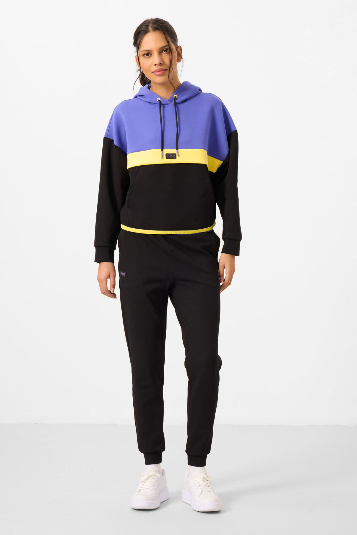 Siyah Kapüşonlu Pamuklu Renk Bloklu Kadın Eşofman Takım - 95327