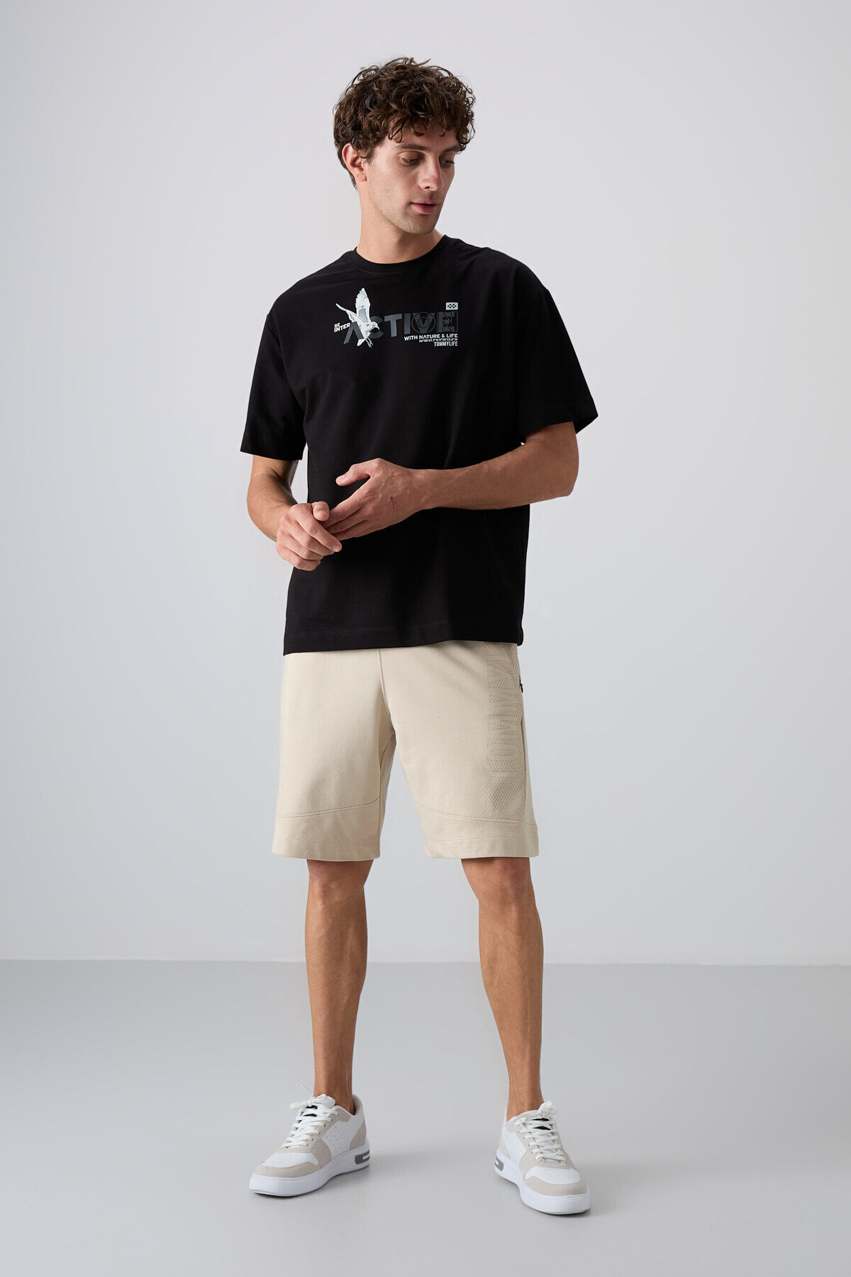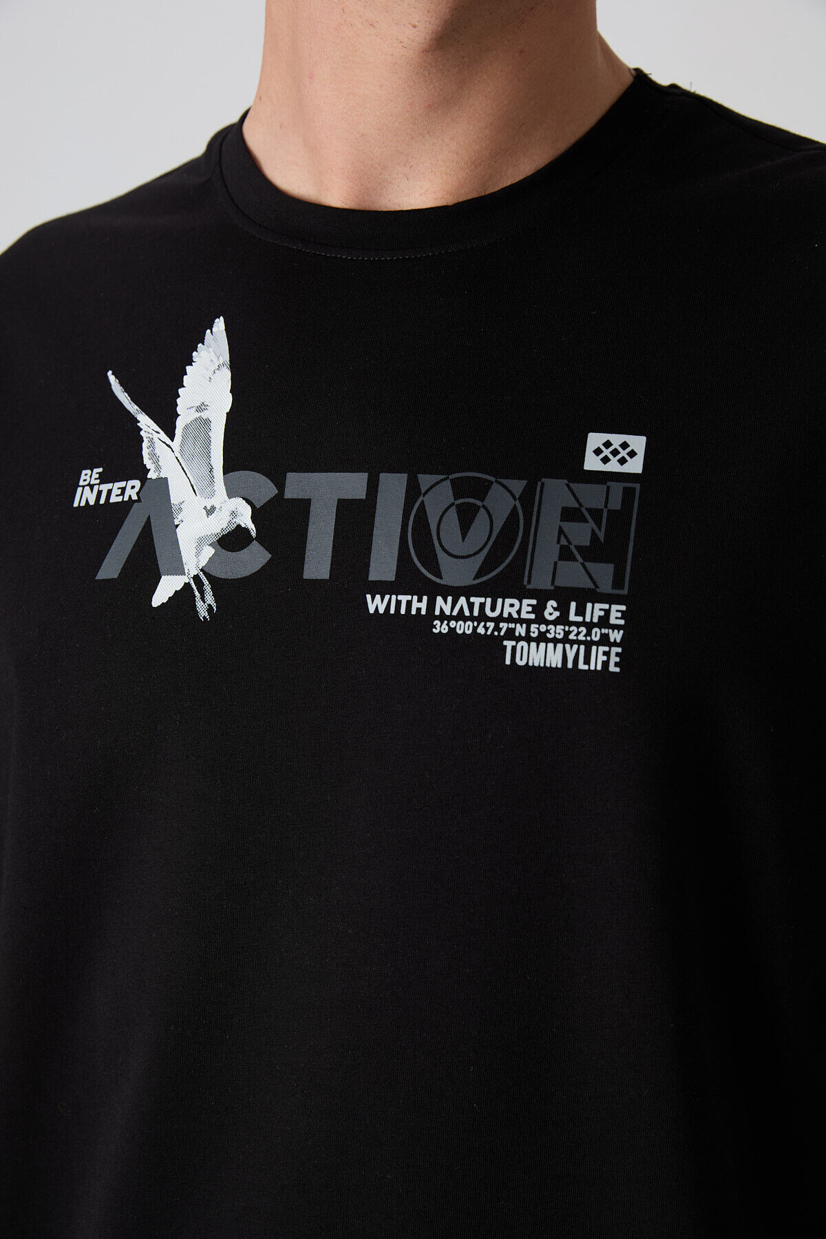 TommyLife Siyah Pamuklu Kalın Yumuşak Dokulu Oversize Fit Baskılı Erkek T-Shirt - 88344