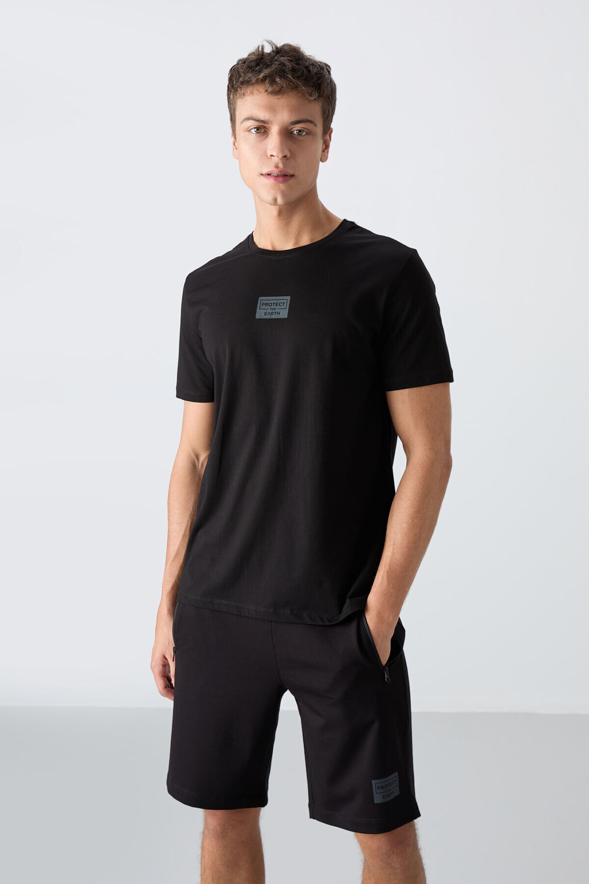Siyah Pamuklu Yumuşak Dokulu Standart Fit Baskılı Erkek Şortlu Takım - 85243