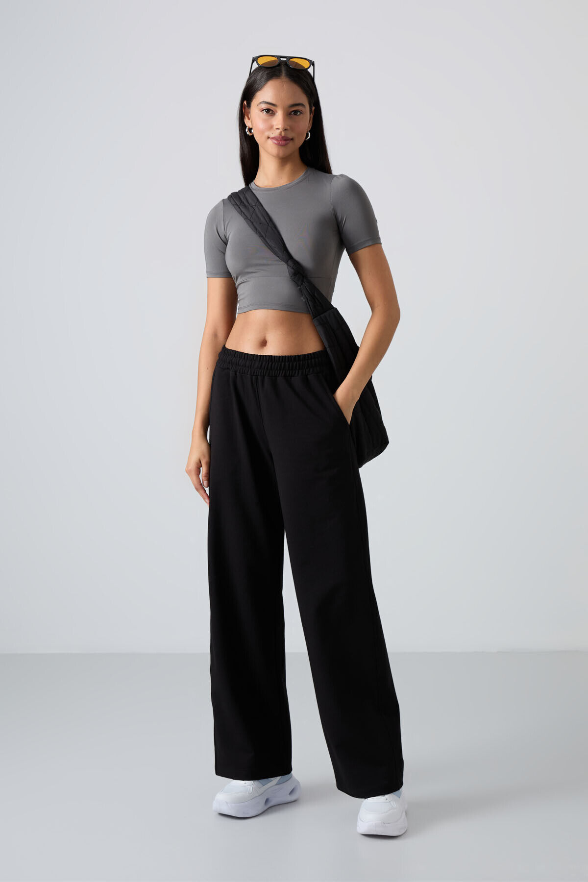 TommyLife Siyah Yüksek Bel Cepli Rahat Form Geniş Paça Kadın Eşofman Alt - 94567