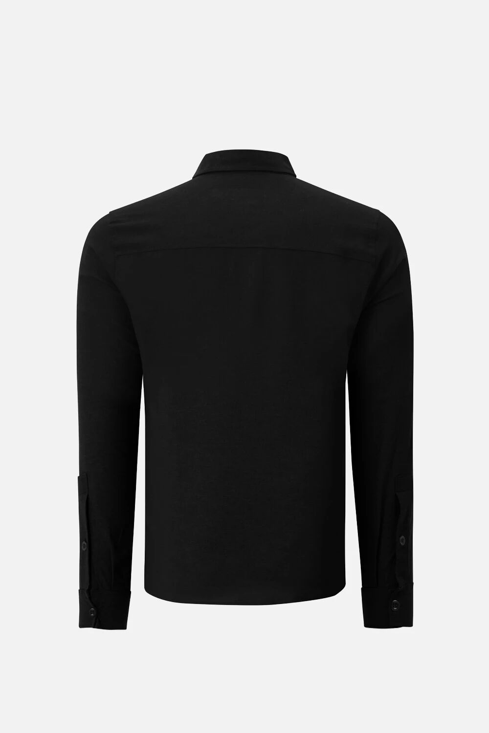 Yanıt: Siyah renkte olan VANEDA V-Clutch erkek keten gömlek, şıklığı ve zarafeti bir arada sunar.