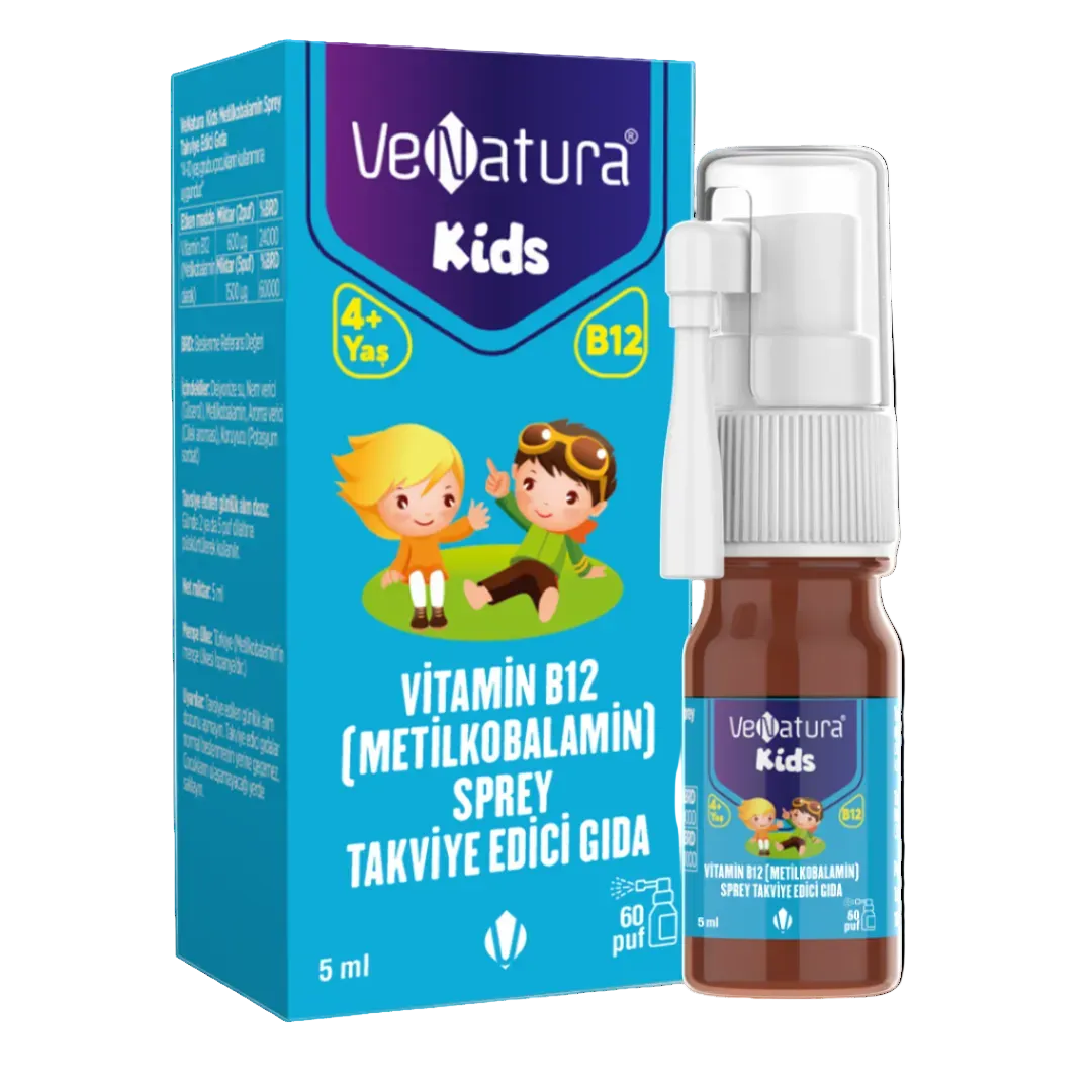 Venatura Kids Metilkobalamin Sprey, B12 vitaminini metilkobalamin formunda sunan ve doğrudan ağıza püskürtülerek kullanılan bir çocuk takviyesidir. Sprey formatı sayesinde tablet, kapsül yutmakta zorlanan çocuklarda rutine eklemeyi kolaylaştırmayı hedefler.