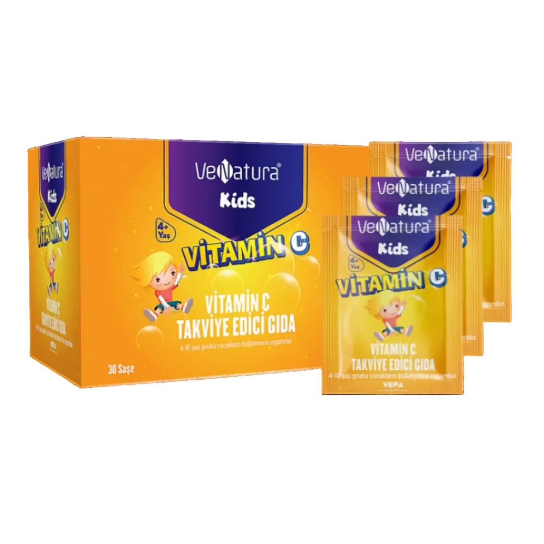 Venatura Kids Vitamin C çocuklara yönelik saşe formda C vitamini takviyesidir. Toz içeriğin suyla karıştırılarak tüketilmesi tablet, kapsül tercih etmeyen çocuklar için pratik bir alternatif sunar.