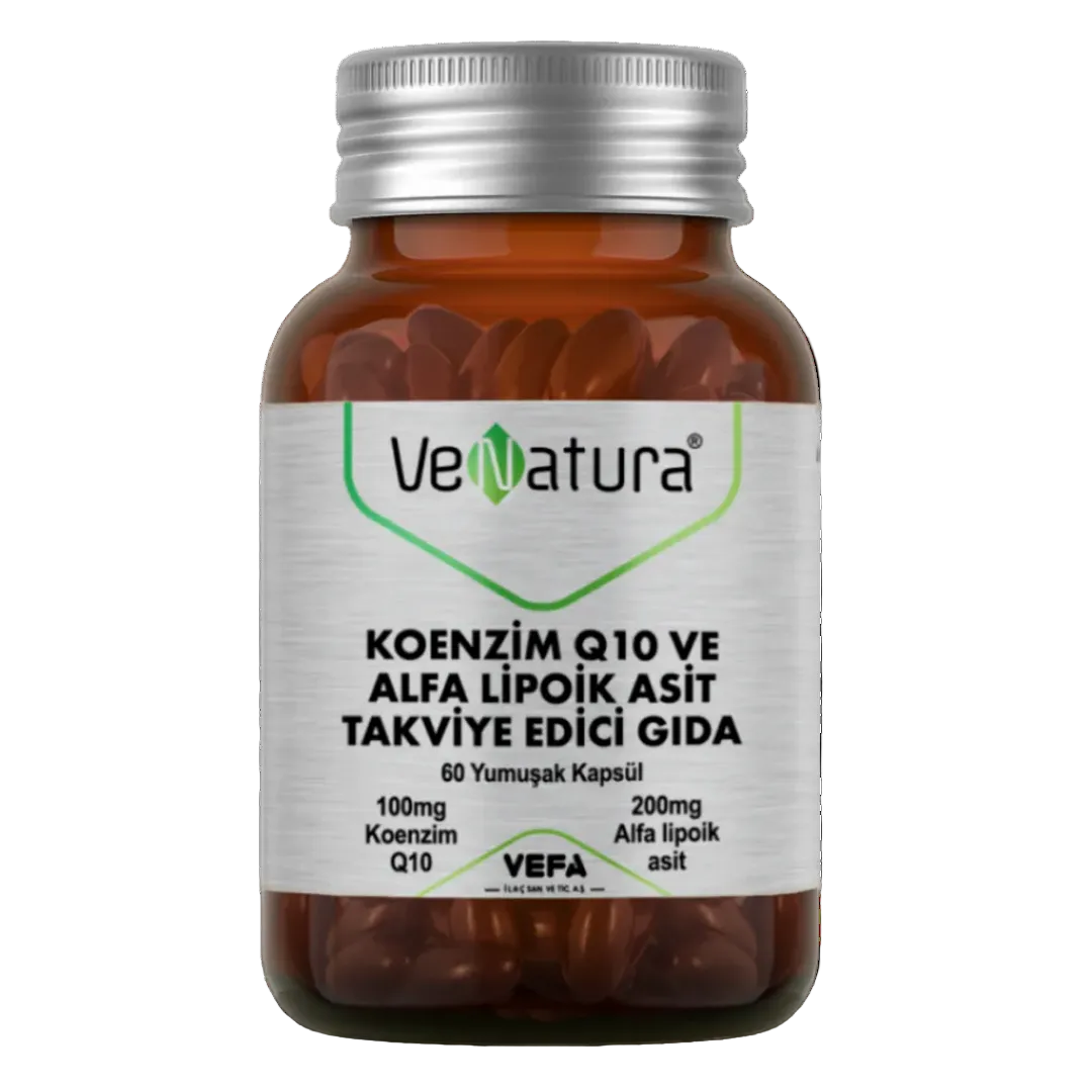 Venatura Koenzim Q10 Ve Alfa Lipoik Asit Takviye Edici Gıda koenzim Q10 ve alfa lipoik asidi aynı kapsülde bir araya getiren tanımlanmış bir kombinasyon takviyesidir. Yumuşak kapsül yapısı sayesinde ölçü ayarlama ya da karıştırma gerektirmez.