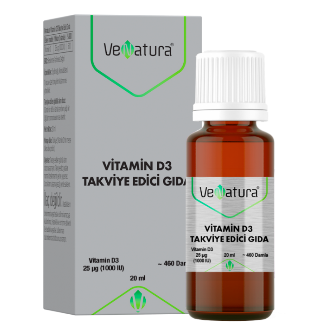Venatura Vitamin D3 Takviye Edici Gıda 20 ml Damla D3 vitaminini yağ bazlı bir damla formunda sunan takviye edici bir gıdadır. Amber cam şişe kullanımı gibi detaylar kullanım deneyimini tamamlayan unsurlar arasında yer alır.