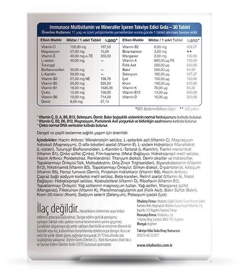 Immunace®, 24 farklı besin maddesi içermektedir. Immunace®, içerisindeki C, D, A, B6, B12 vitaminleri, Selenyum, Demir ve Bakır bağışıklık sisteminin normal fonksiyonuna katkıda bulunur. Immunace®’in vitamin, mineral, antioksidanlar ve aminoasitler içeren özel formülü Vitabiotics’in beslenme uzmanlarının uluslararası beslenme uzmanlarıyla iş birliği sonucu geliştirilmiştir1.