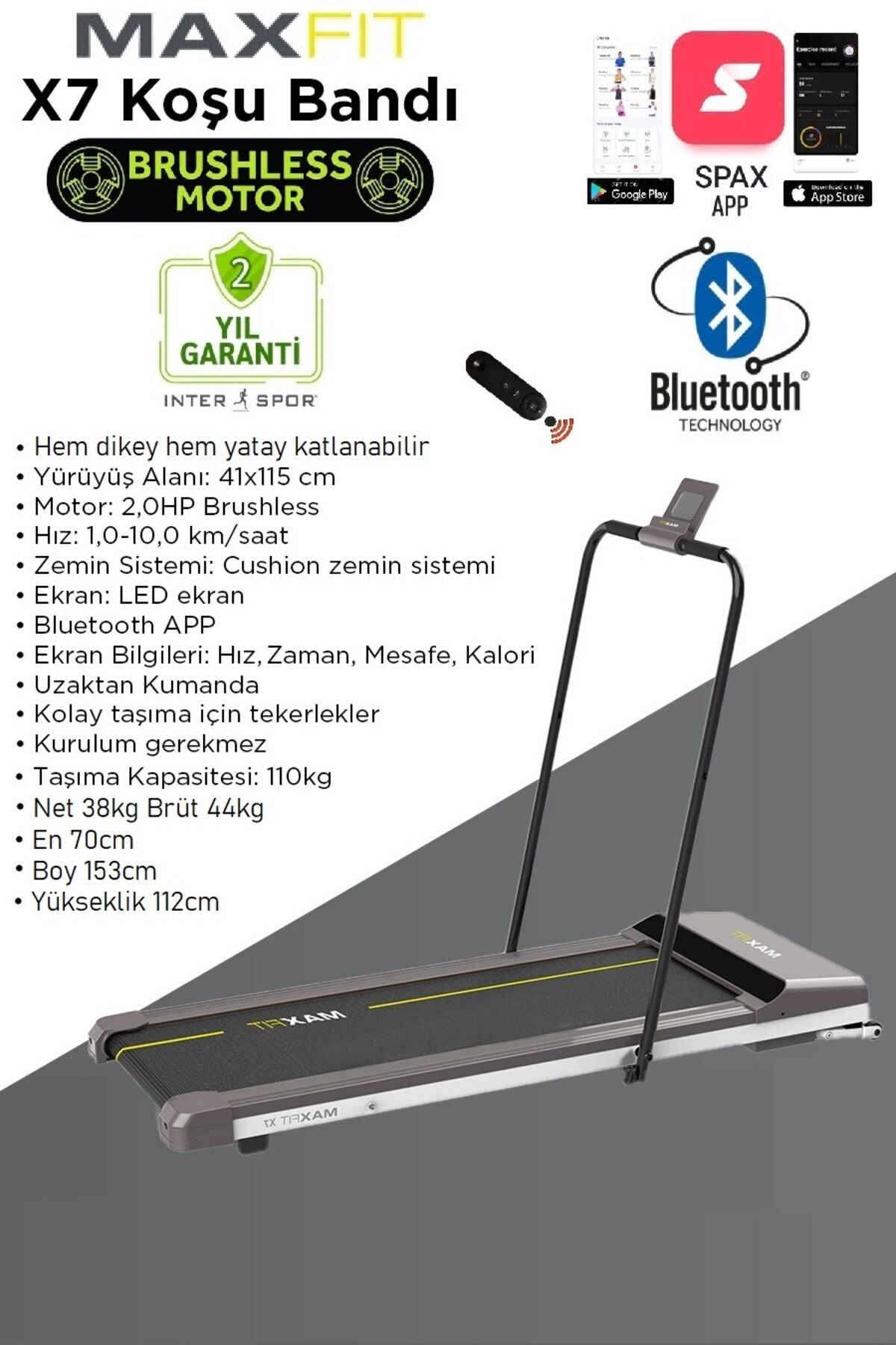 Voit Garantili Maxfit X7 Uzaktan Kumandalı Bluetoothlu Brushless Motorlu Koşu Bandı 110kg