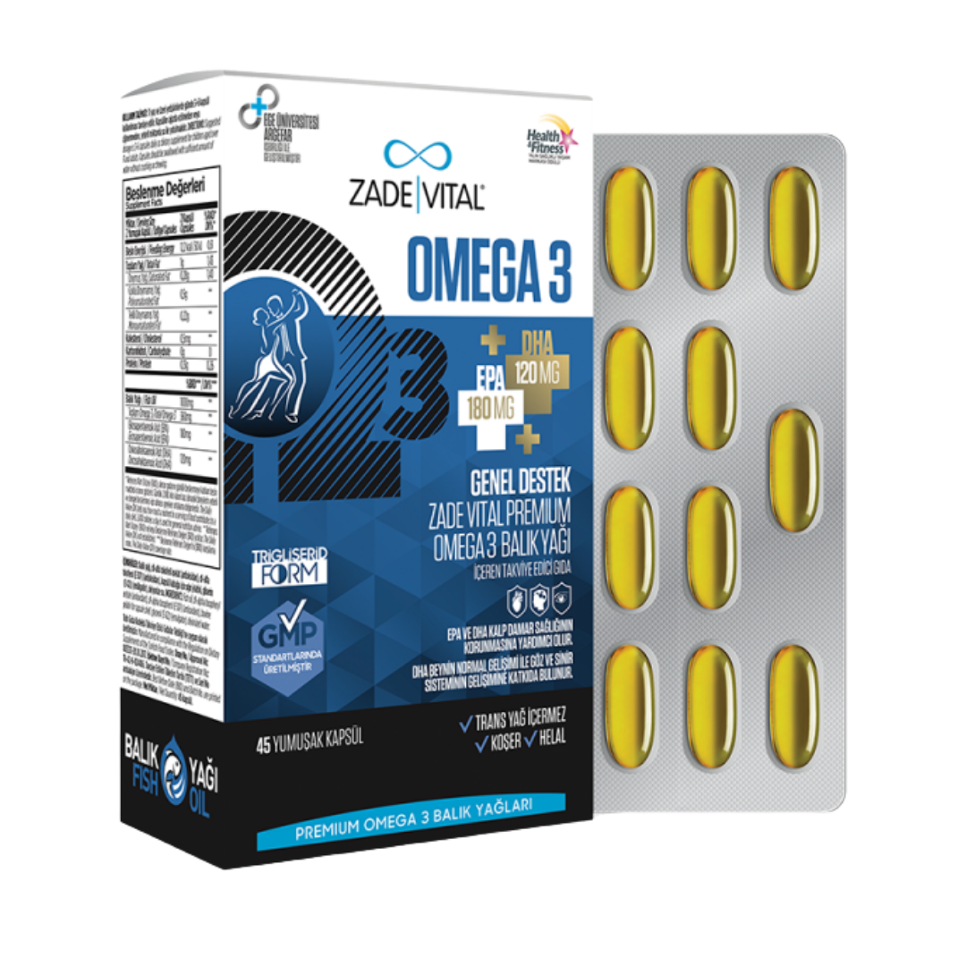 Zade Vital Omega 3 Balık Yağı Beslenme Değerleri: 2 Kapsül Balık Yağı 1000 mg Toplam Omega 3 360 mg EPA 180 mg DHA 120 mgZade Vital Omega 3 Balık Yağı Nedir?