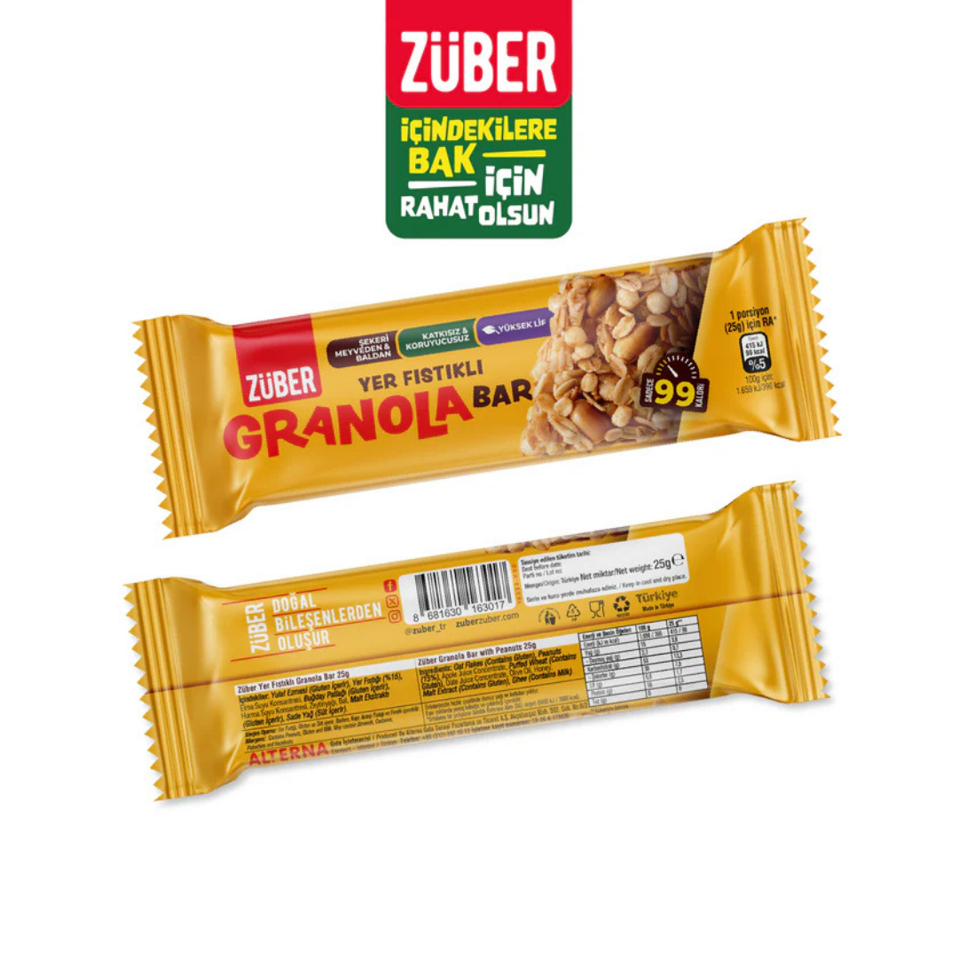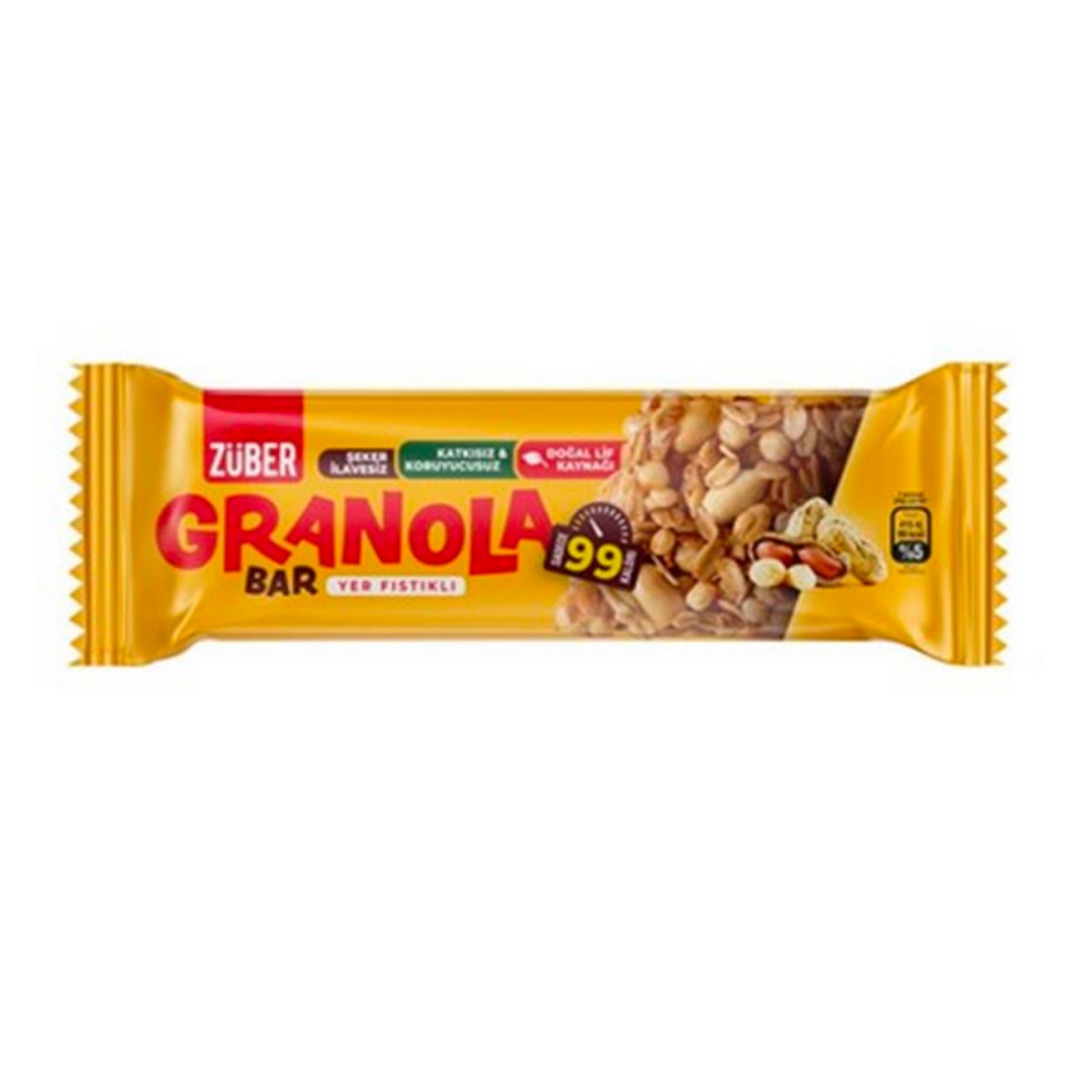 ZÜBER Yer Fıstıklı Granola Bar 25g, kıtır granola dokusunu yer fıstığının yoğun aromasıyla birleştiren, tekli bar formatında pratik bir atıştırmalıktır.
